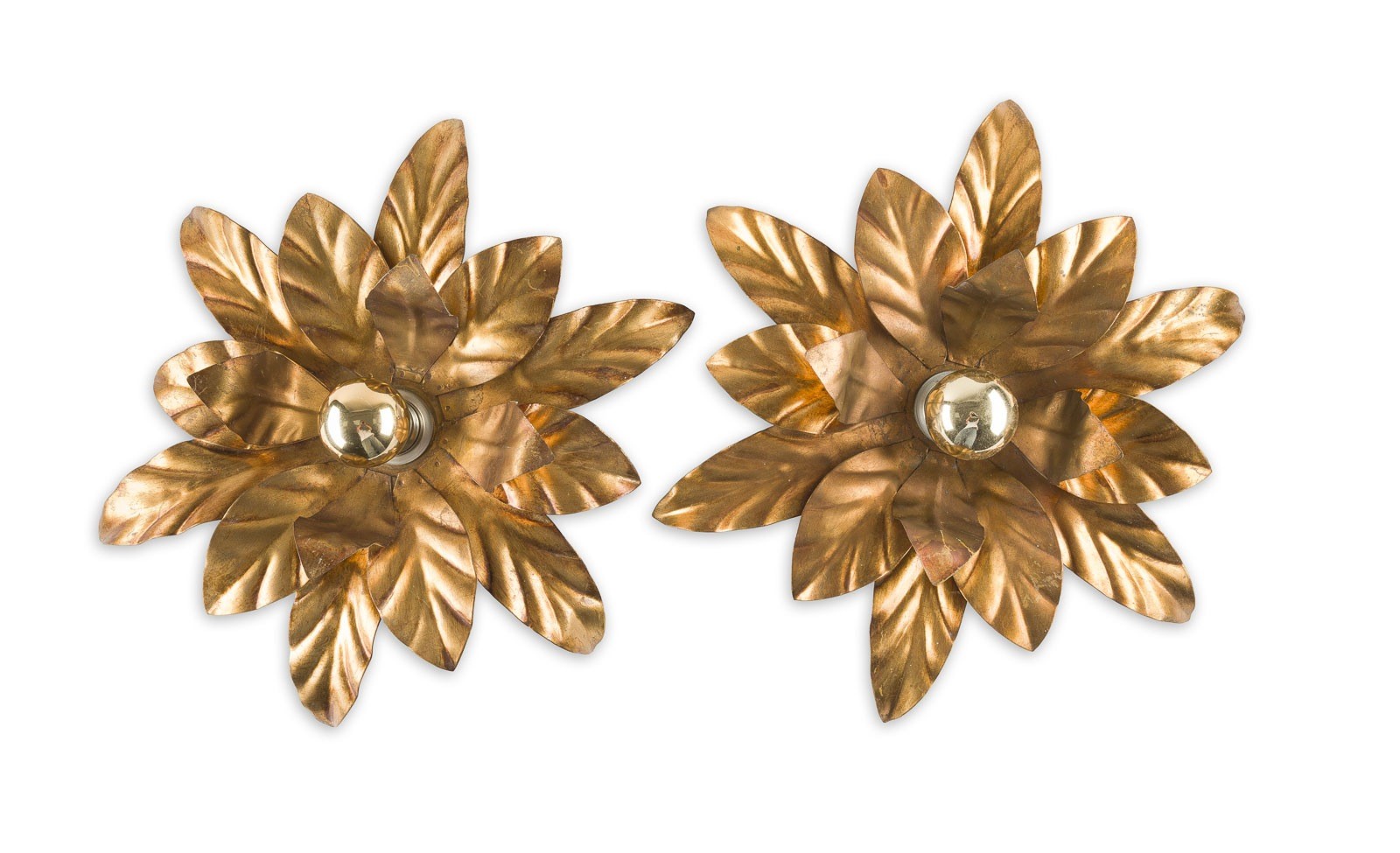 HANS KÖGL (ATTR. ) PAIR OF 'LEAVES' WALL / CEILING LAMPS Italy / Germany around 1980 Steel, antique gold finish, each single light electrified. H. 14 cm, D. 45 cm. Minor traces of use.