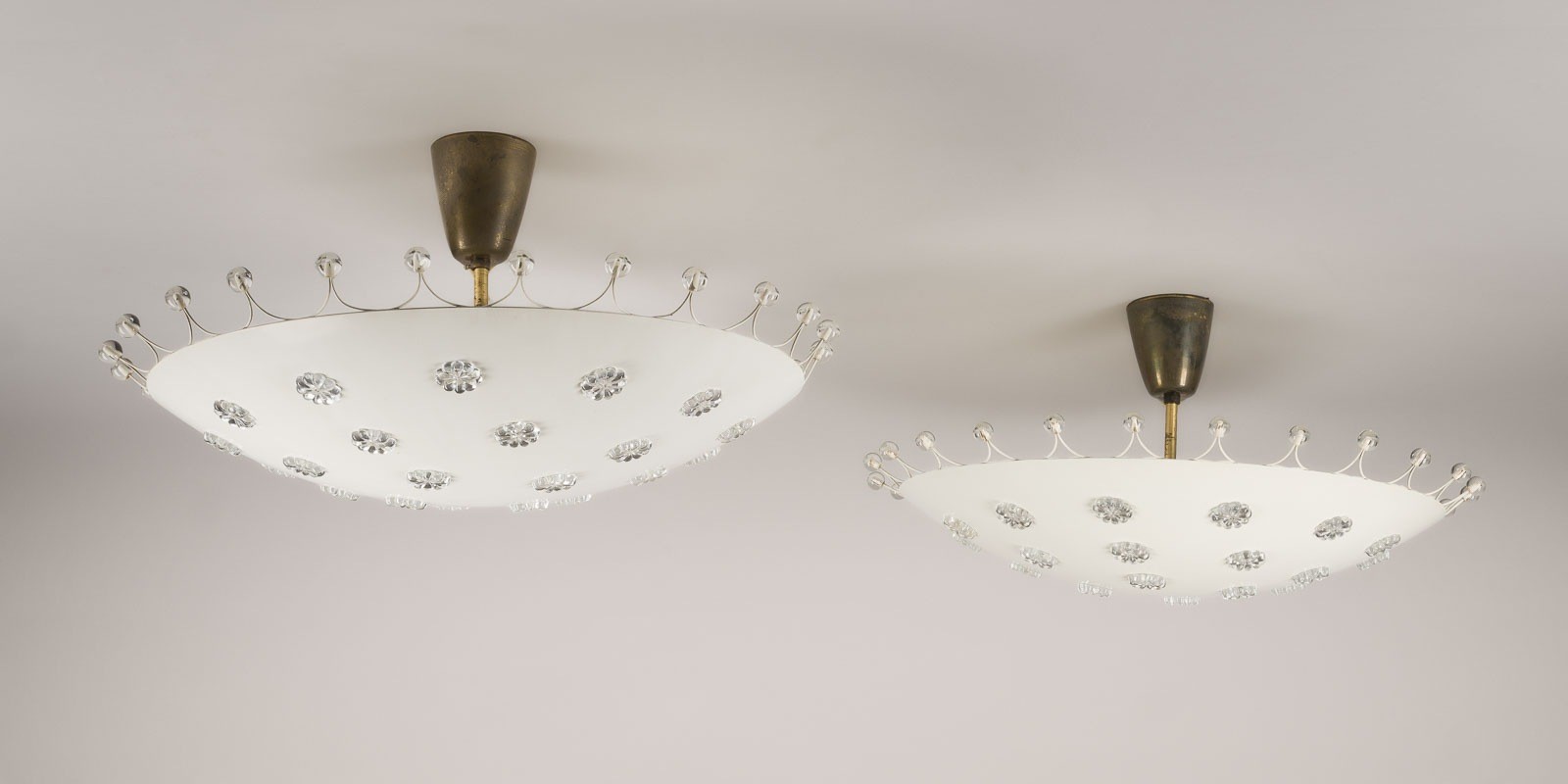 EMIL STEJNAR (IN THE MANNER OF) PAIR OF CEILING LIGHTS Germany, Design of the 1950s Brass, lacquered steel, glass petals and balls, each 4-light electrified. Each H. approx.26 cm, D. max. 50 cm. Minor traces of use. Only EU in-house shipping available.