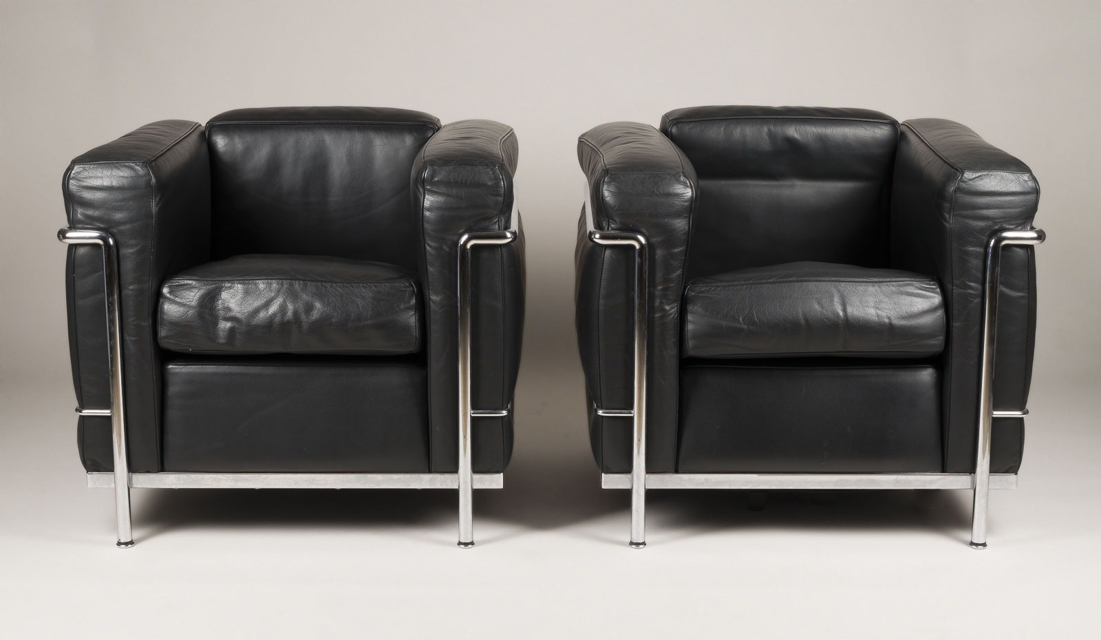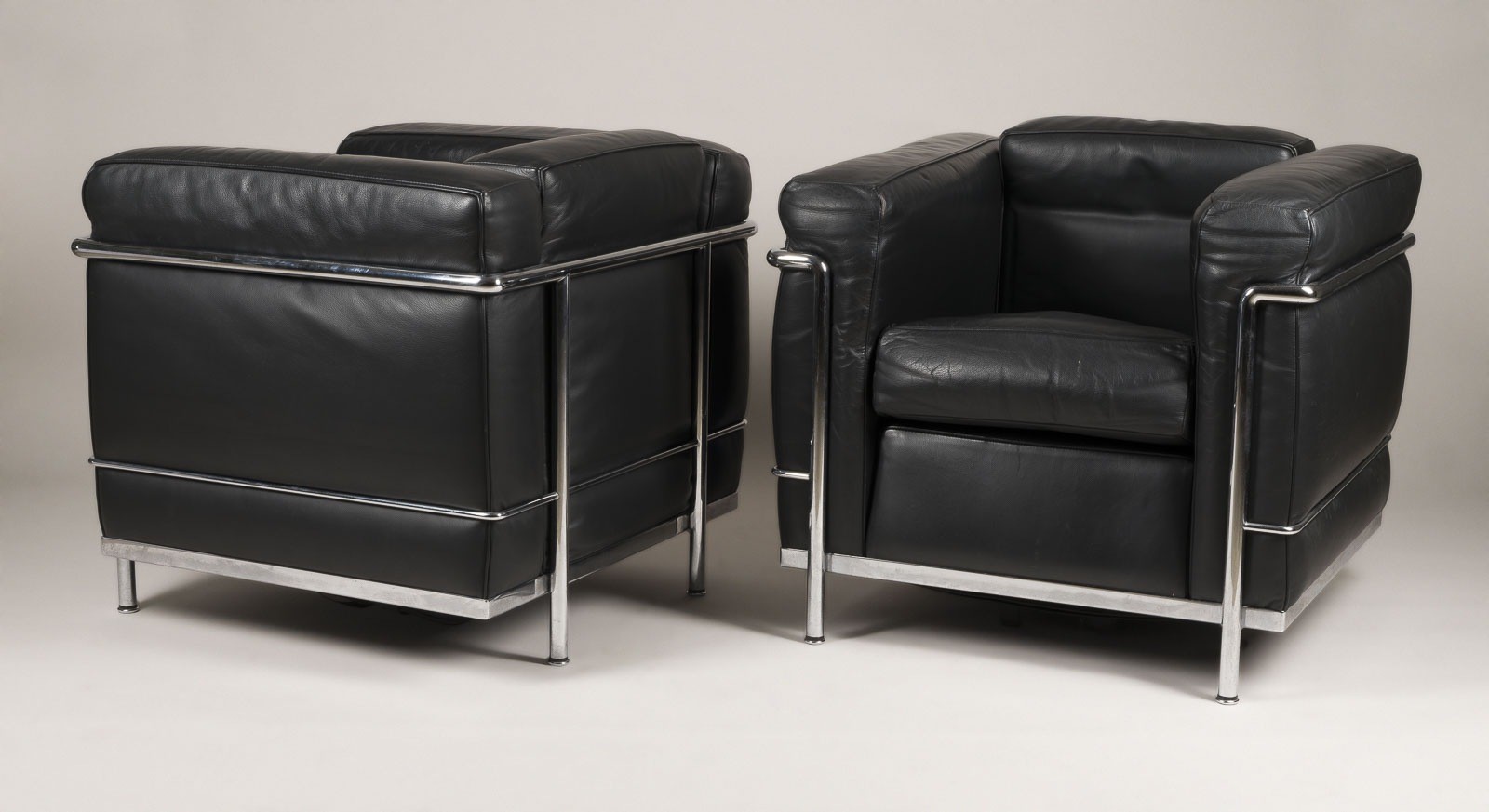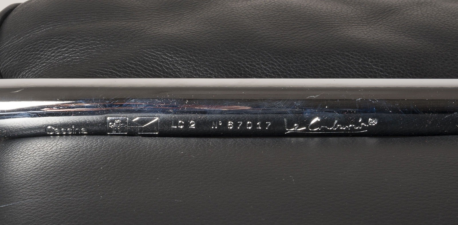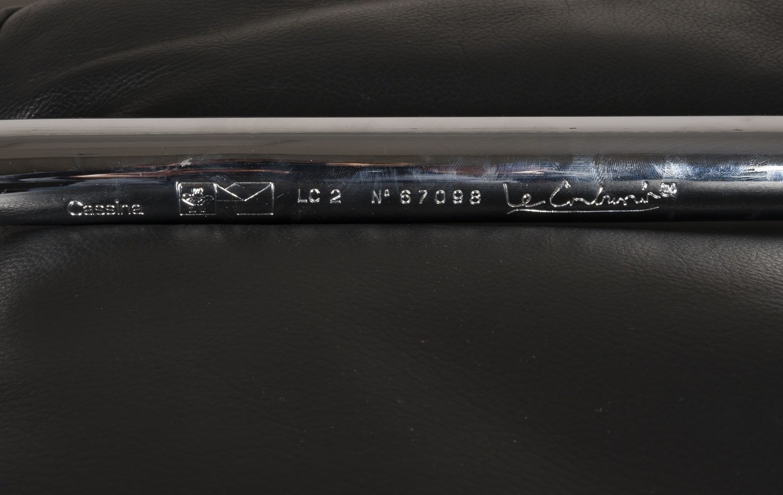 LE CORBUSIER, JEANNERET & PERRIAND PAIR OF 'LC-2' ARMCHAIRS 'GRAND CONFORT' Italy, Cassina, designed in 1928, probably made circa 1995 Chrome-plated steel and tubular steel, upholstered cushions, black leather cover. H. 68 cm, W. 76 cm, D. 68 cm. Engraved on the tube 'Cassina LC 2, No 67017 resp. No 67098, Facsimile signature Le Corbusier'. Light age-related wear, straps underneath are sagging. No in-house shipping available.