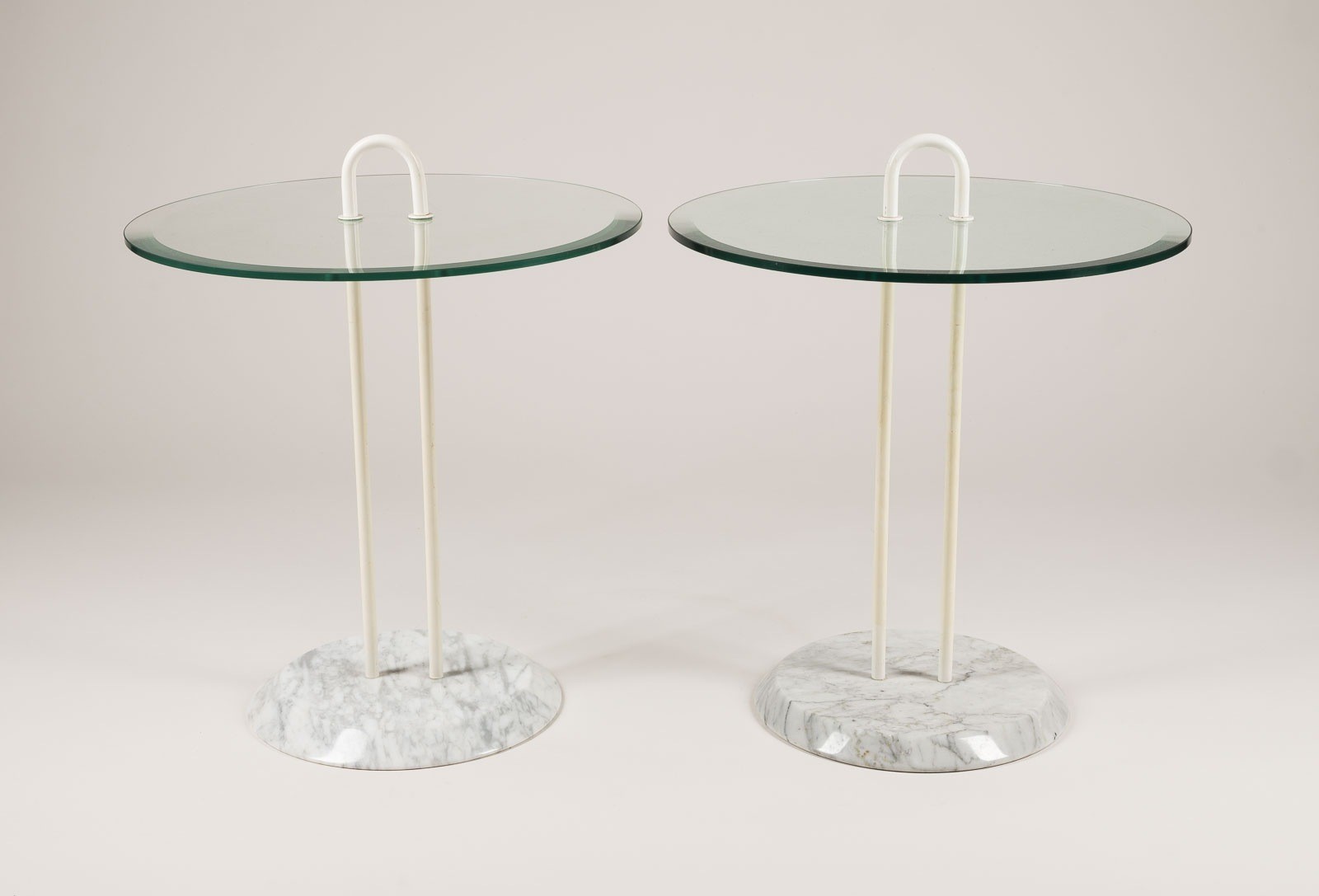 CATTELAN ITALIA Carrè / Vicenza PAIR OF 'OTELLO' SIDE TABLES Italy, Cattelan Italia, circa 1985 Polished marble, lacquered metal, crystal glass top. H. 61 cm, D. max. 50 cm. Light traces of use. No in-house shipping available.
