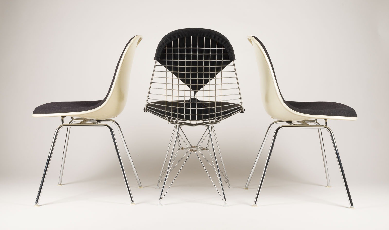 CHARLES UND RAY EAMES 1907 -1978 und 1912 - 1988 TWO SIDE CHAIRS 'DSX' AND 'BIKINI WIRE CHAIR' 'DKR-2' Herman Miller / Vitra, designed in 1950/1951 Chrome-plated tubular steel 'H-Base', cream-white fibreglass shell, fully upholstered, black hopsak. 'Eiffel-Base' and seat shell, chrome-plated steel wire, two.piece 'Bikini' cover, black hopsak. H. 80 / 83 cm, W. 46 / 49 cm, D. 52 /53 cm. One chair marked underneath.Light traces of use, one foot glider missing. No in-house shipping available.
