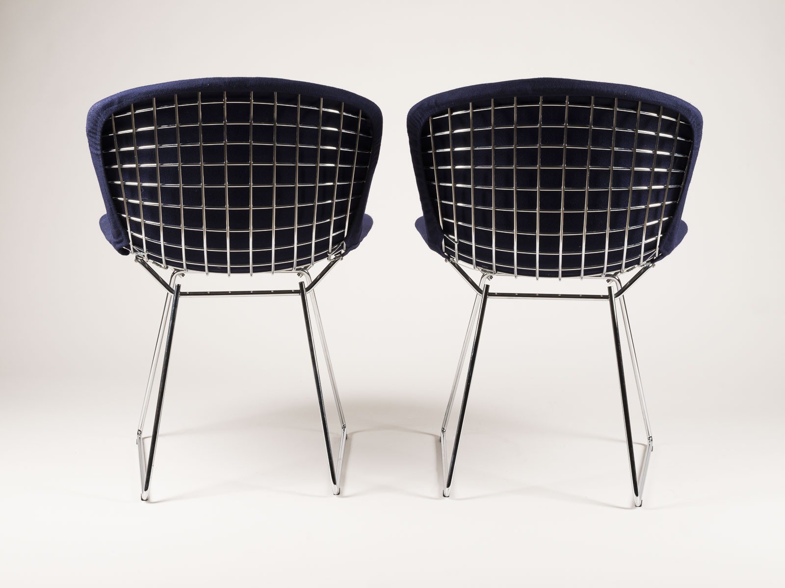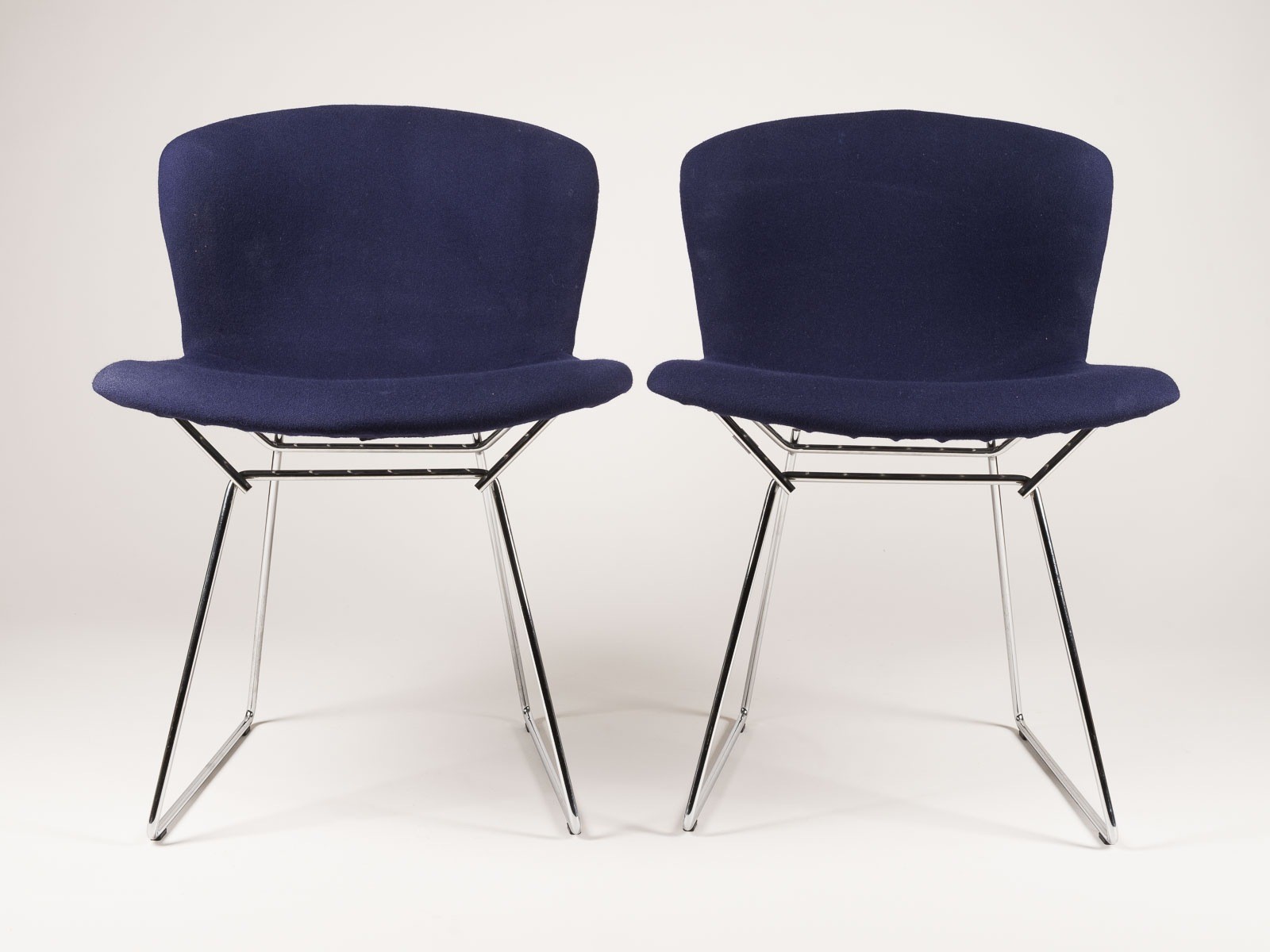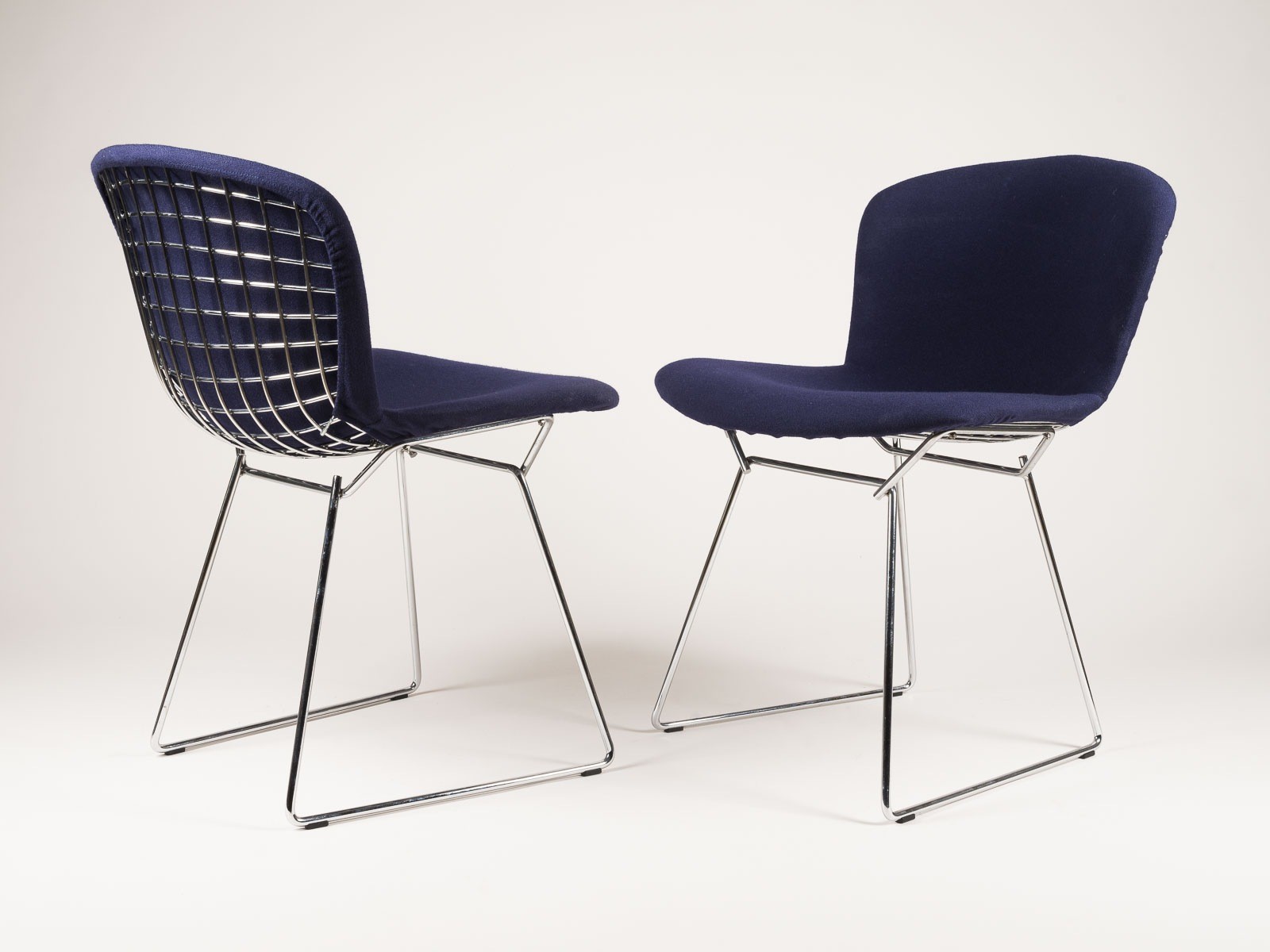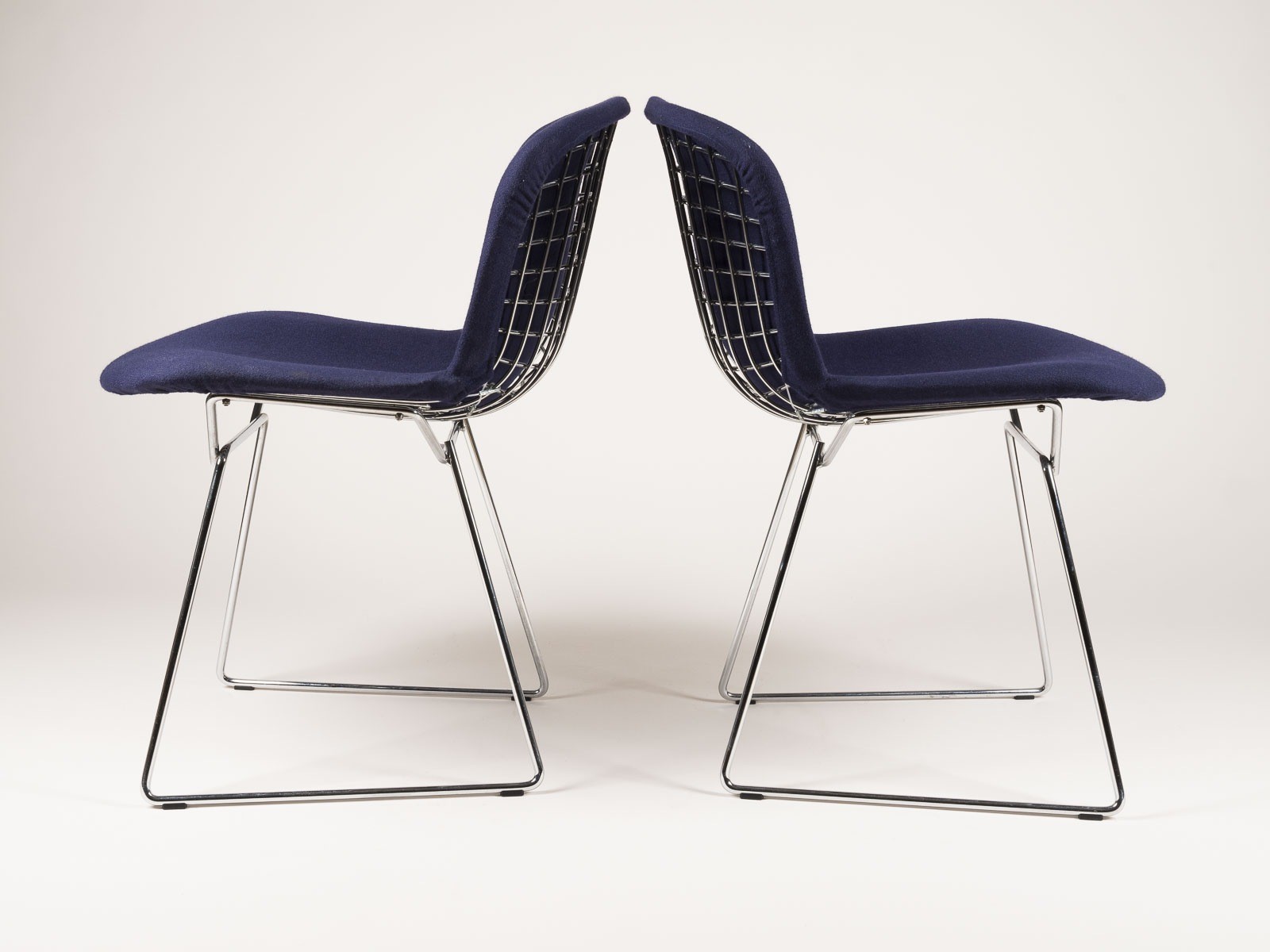 HARRY BERTOIA 1915 San Lorenzo, Italy - 1978 Barto, Pennsylvania, USA PAIR OF MODEL '420' SIDE CHAIRS USA / Germany, Knoll International, Design of 1952 Chrome-plated steel wire, seat cushion shell, dark blue fabric cover, foot glides. H. 75 cm, W. 54 cm, D. 59 cm. Only minor signs of wear. No in-house shipping available.