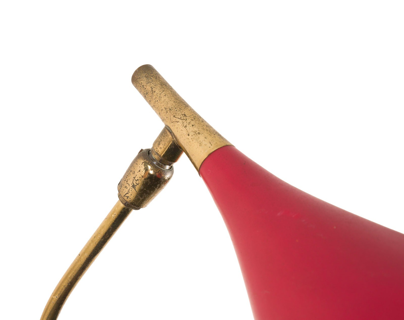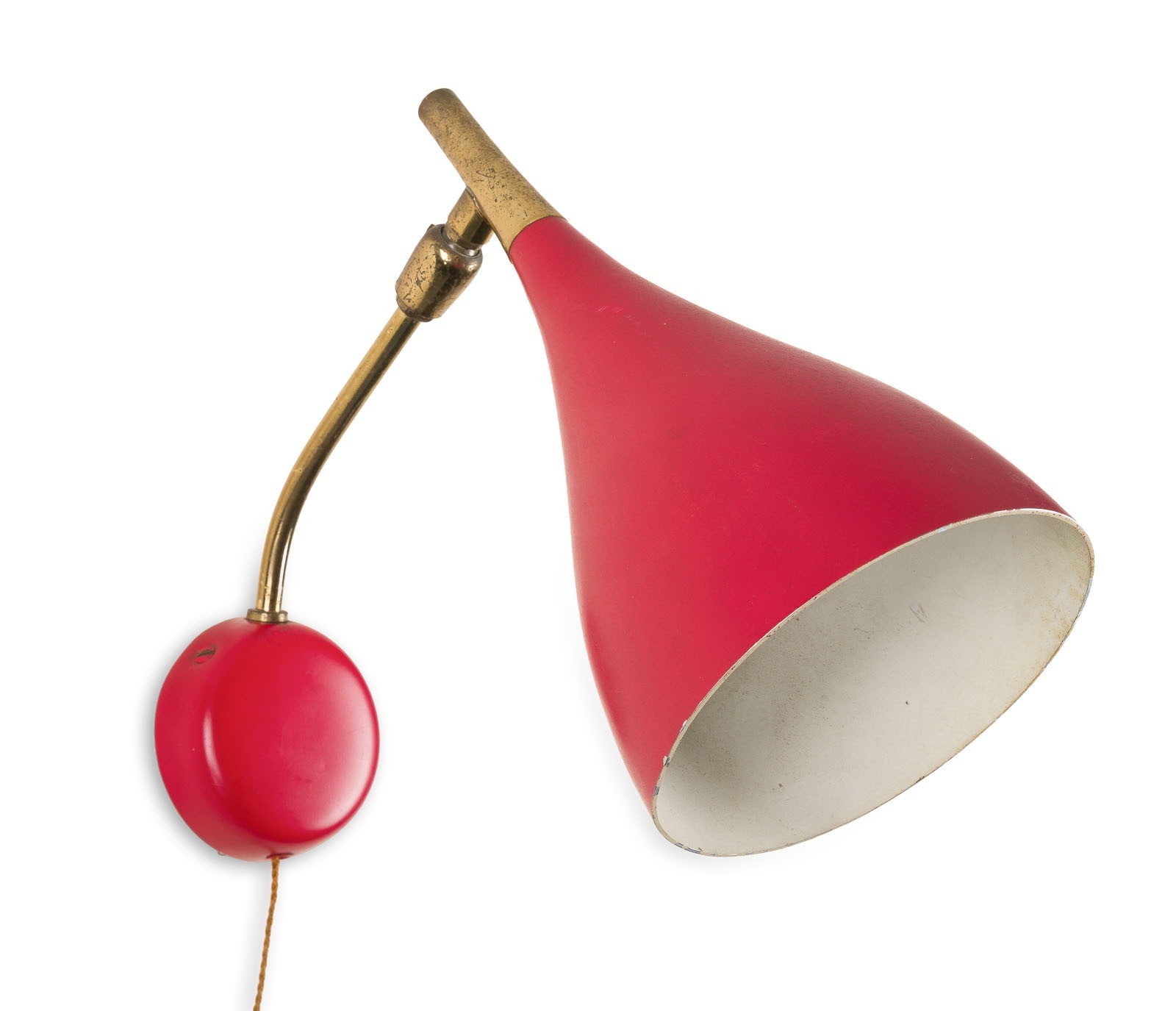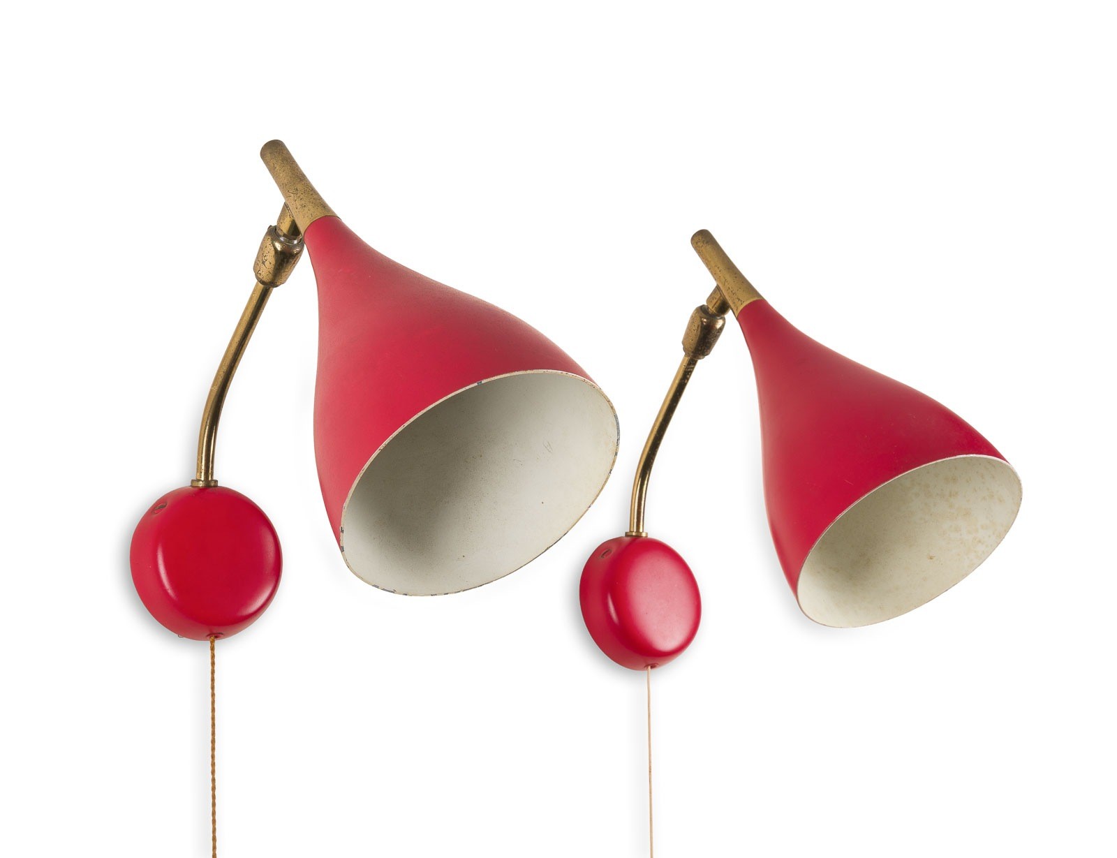 KARL HEINZ KINSKY Germany PAIR OF MODEL '8806' WALL LIGHTS Germany, Gebrüder Cosack, designed around 1955 Polished brass, lacquered aluminium, each single-light electrified, w. pull switch, function untested. Each H. approx. 22 cm, W. max. 11 cm, D. approx. 24 cm.Some age related wear.