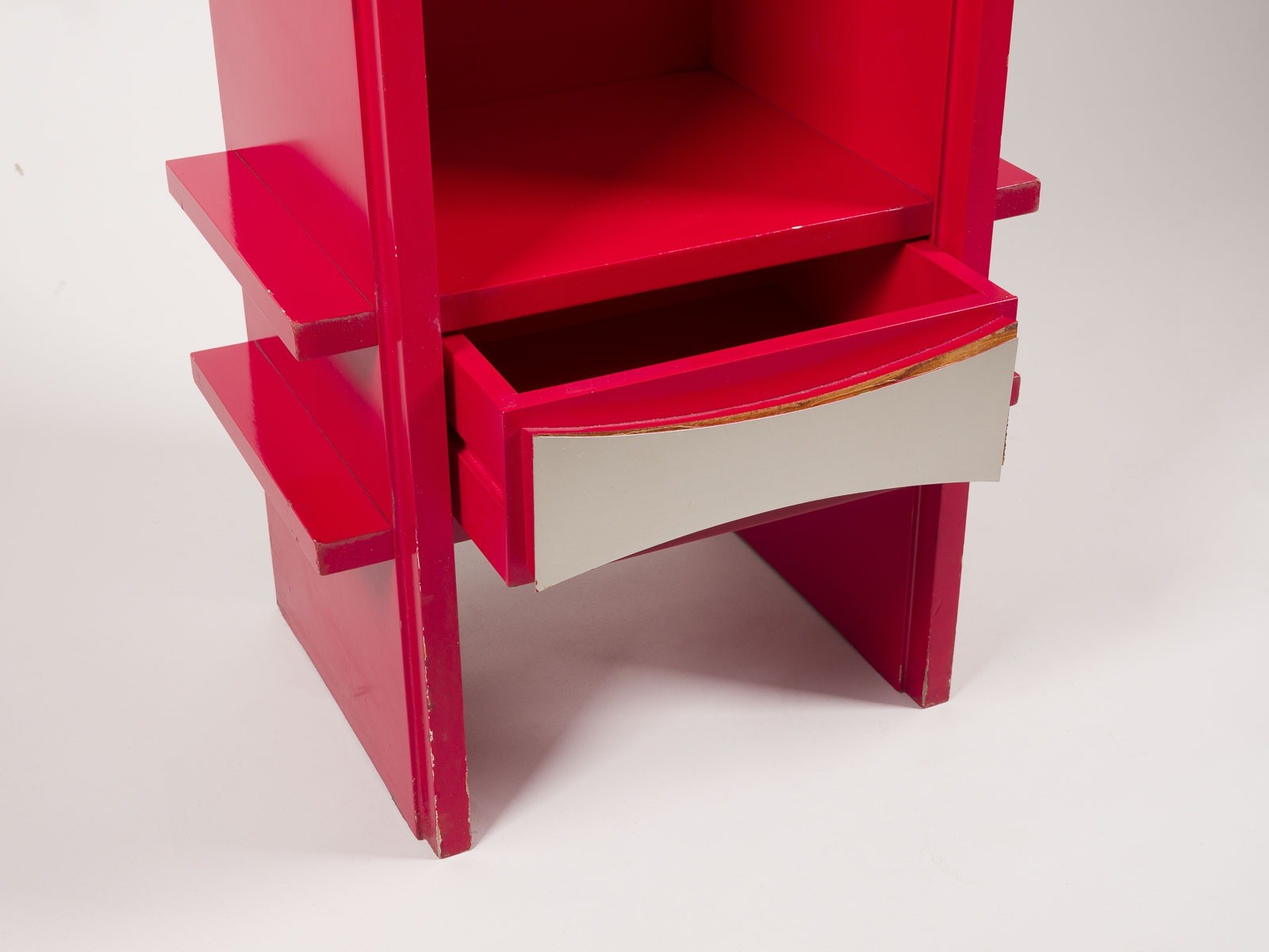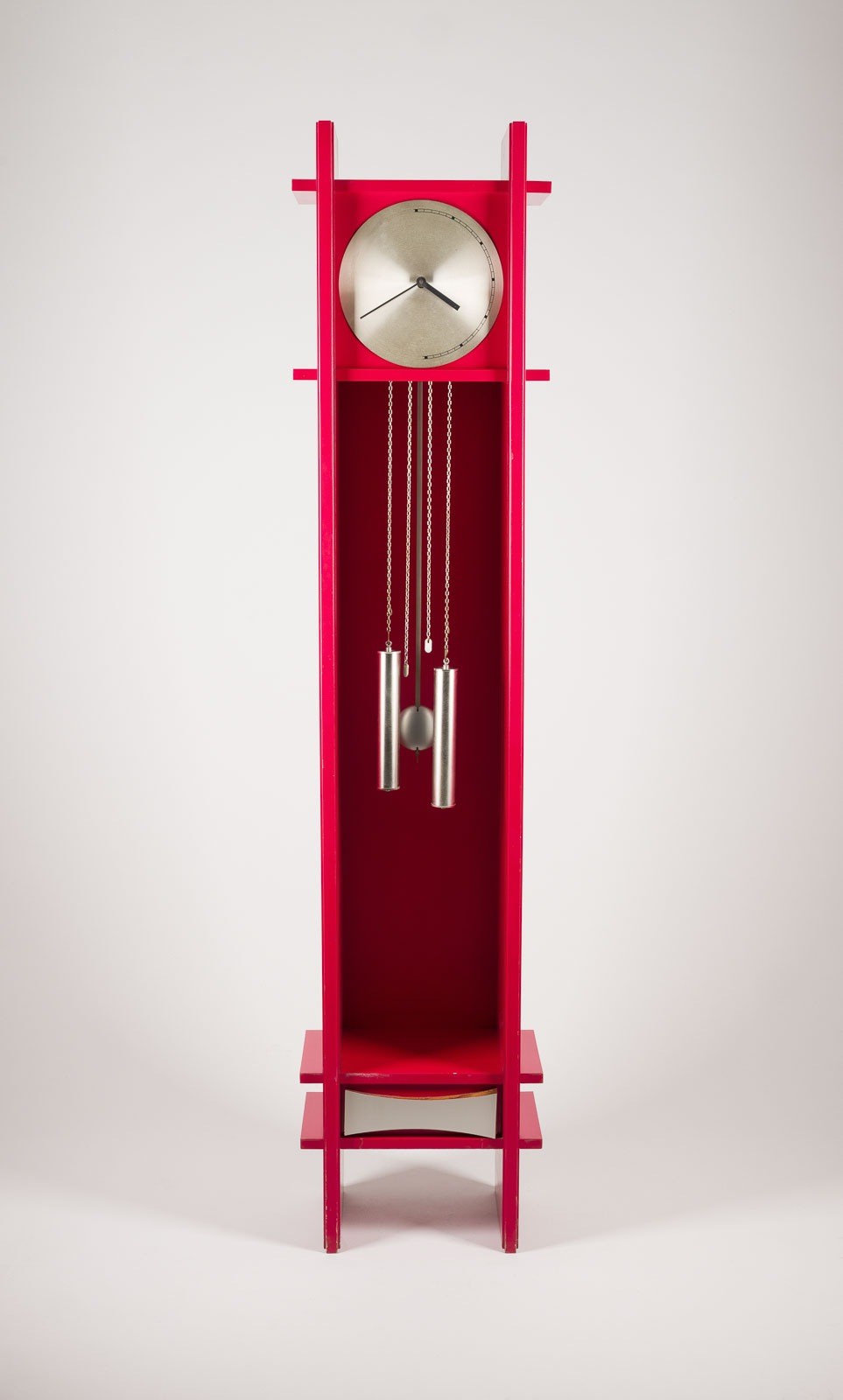 HORST BRÜNING 1934 Hamburg RARE STANDING CLOCK Germany, Biesterfeld & Weiss, designed in 1966 Red lacquered wood, nickel-plated metal, anodised aluminium. H. 190 cm, W. 42 cm, D. 28 cm. Some minor signs of age related wear, function not tested. No in-house shipping available. Literature: MD magazine, moebel interior design, 2 1967, ill. p. 75.