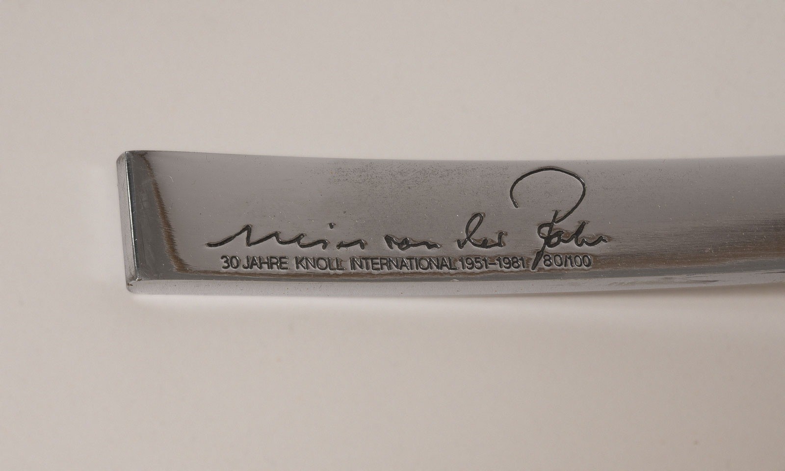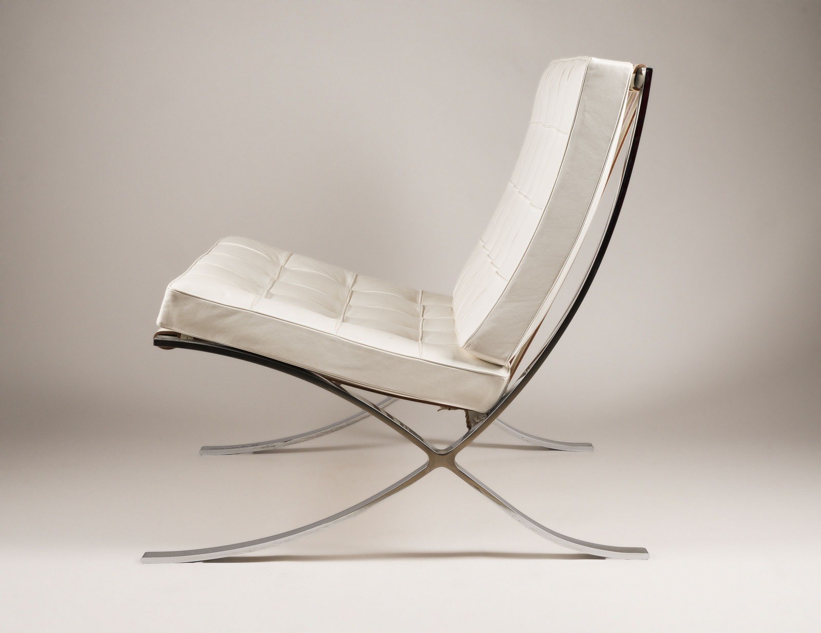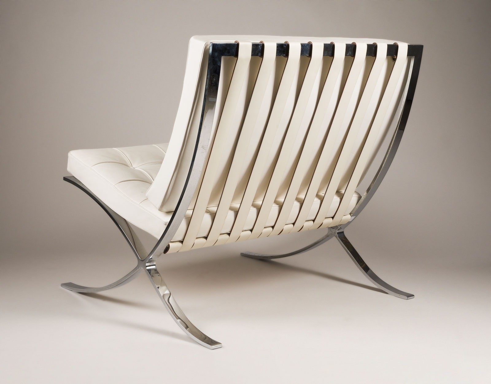 LUDWIG MIES VAN DER ROHE 1886 Aachen - 1969 Chicago 'BARCELONA CHAIR' SPECIAL EDITION USA / Germany, Knoll International, Special edition from 1981, no. 80 of 100 chrome-plated flat steel, upholstered cushions with white leather cover. H. 74 cm, W. 74 cm, D. ca. 77 cm. Marked on the frame 'Mies van der Rohe 30 JAHRE KNOLL INTERNATIONAL 1951-1981 80/100' (engraved). Very slight signs of use. No in-house shipping available.