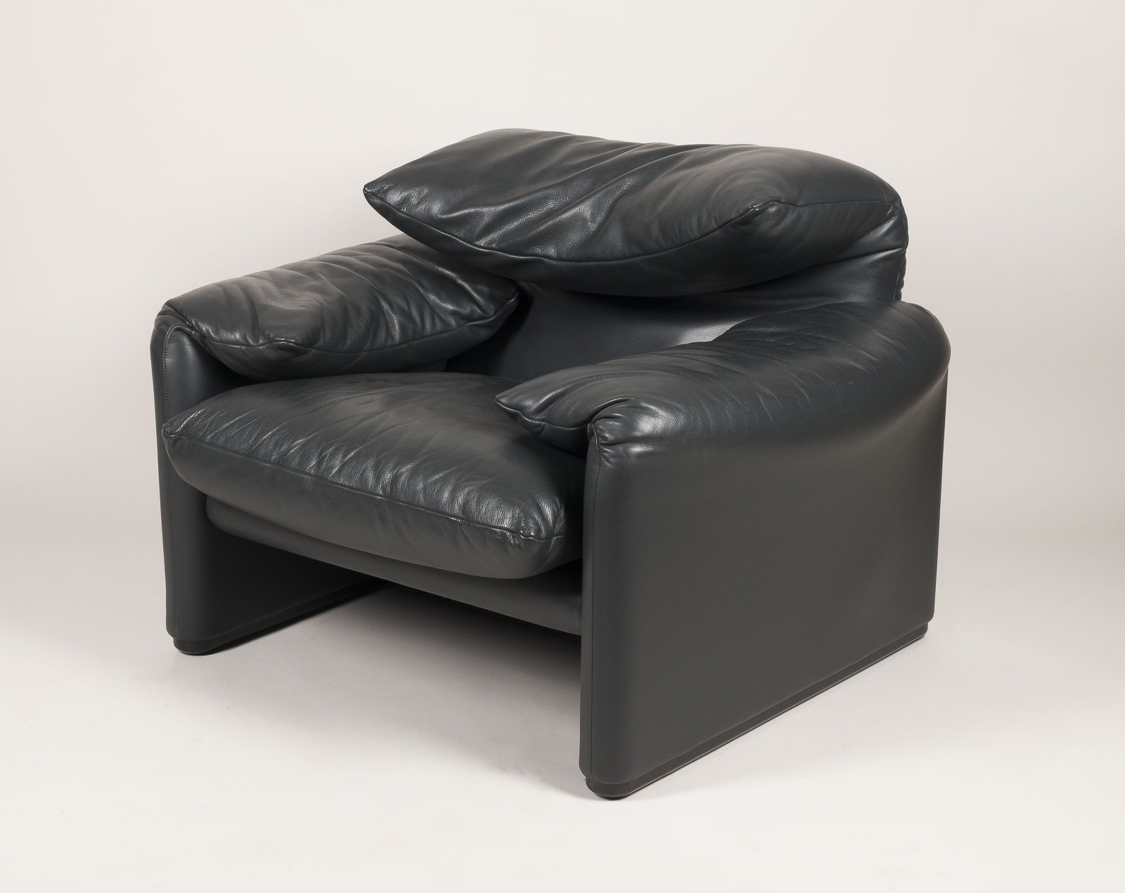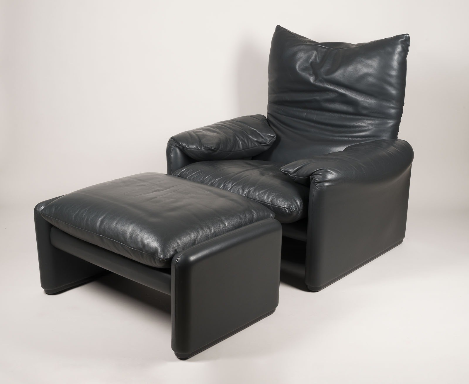 VICO MAGISTRETTI 1920 Mailand - 2006 ibid. 'MARALUNGA' ARMCHAIR AND FOOT STOOL Italy, Cassina, designed in 1973, version circa 1995 Upholstered construction, cushions and coverings, black leather, adjustable backrest. H. 73 / 102 cm, W. 102 cm, D. approx. 84 cm (armchair). Marked 'Cassina MADE IN ITALY' (flag). Minor traces of use. No in-house shipping available.