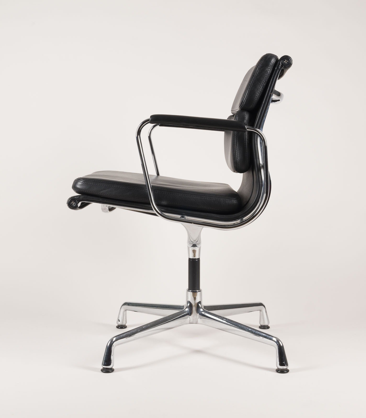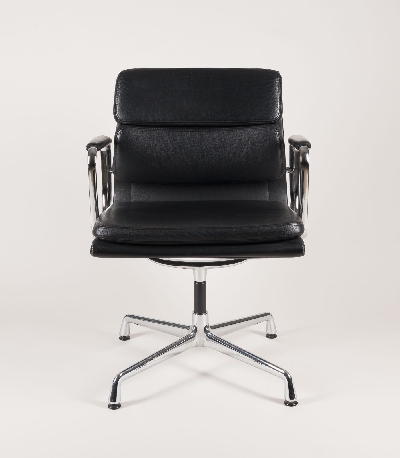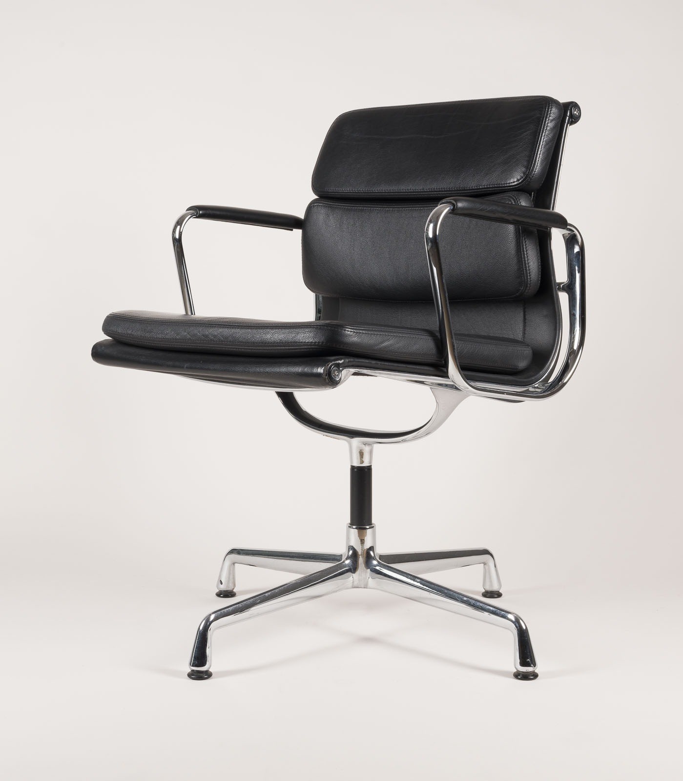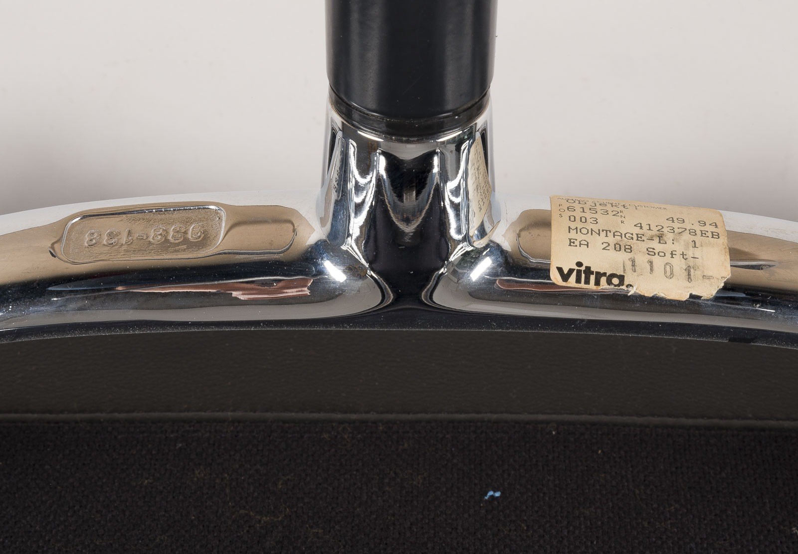 CHARLES UND RAY EAMES 1907 -1978 und 1912 - 1988 A MODEL 'EA 208' SOFT PAD CHAIR Switzerland / Germany, Vitra, Design of 1969, made in 1994 Chrome-plated aluminium, black leather upholstery, details plastic, swivel base with four legs and glides. H. 85 cm, W. 60 cm, D. 56 cm. Marked 'Charles Eames - The authorized original. Vitra' (flag). Equipped with armrests. Only minor signs of wear. No in-house shipping available.