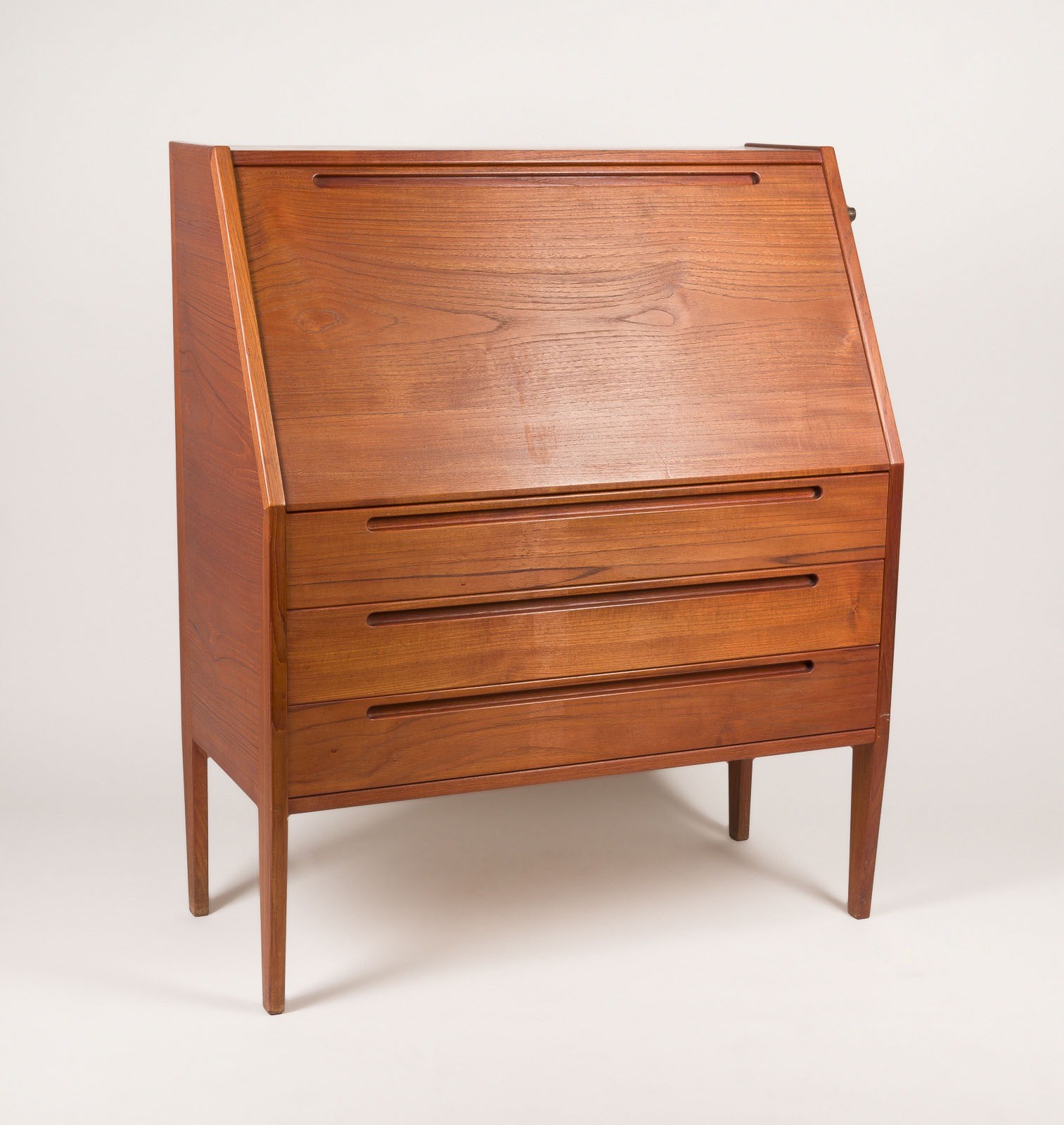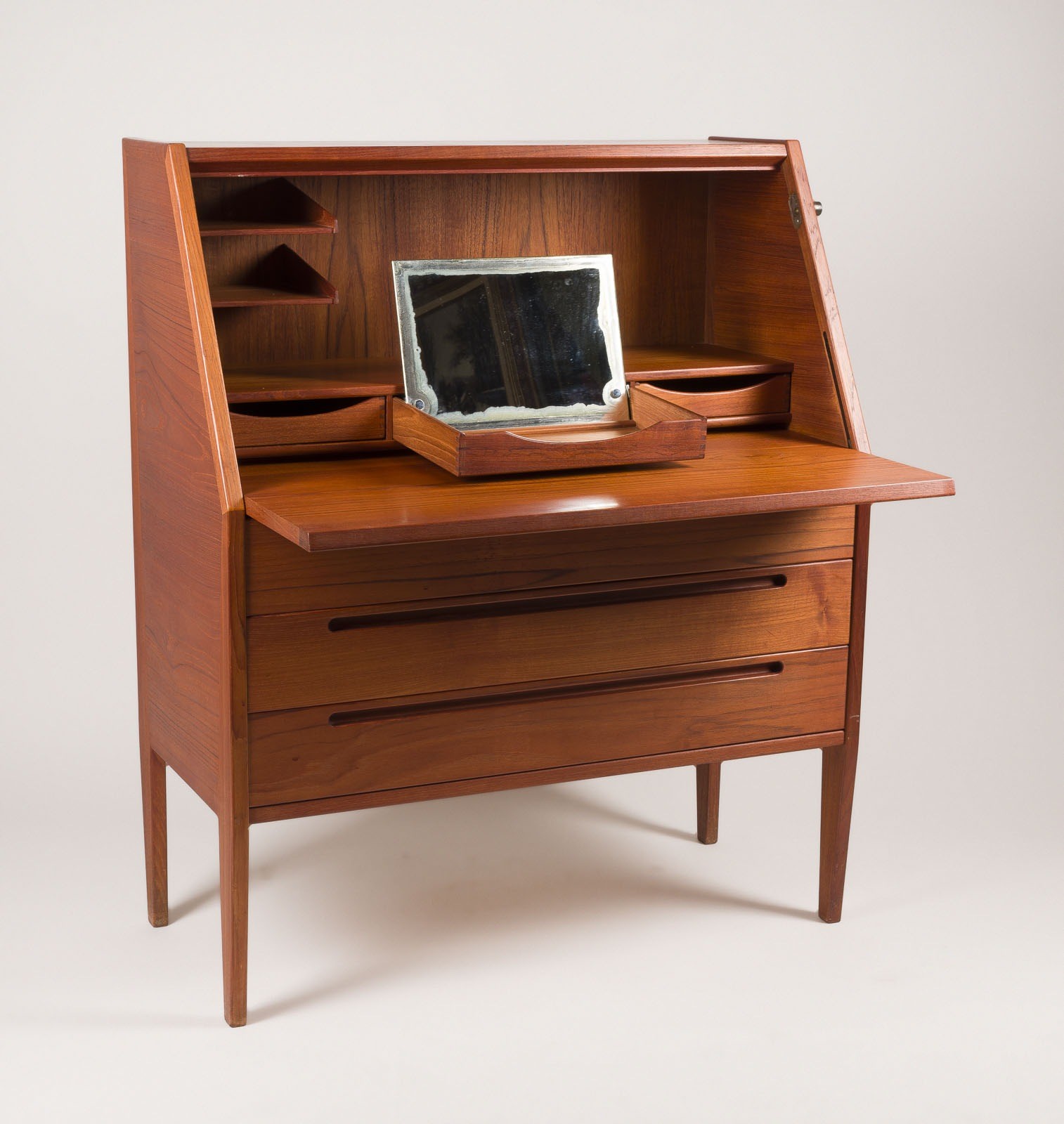 KAI KRISTIANSEN 1929 Denmark MODEL '63' TEAK SECRETARY CABINET Denmark, Tørring Møbelfabrik / HNJ, designed around 1960 Teak and teak veneer, equipped w. lock and key, inside w. mirror. H. 108 cm, W. 90 cm, D. max 43 cm. Some traces of age related wear, partly min. dam. No in-house shipping available..