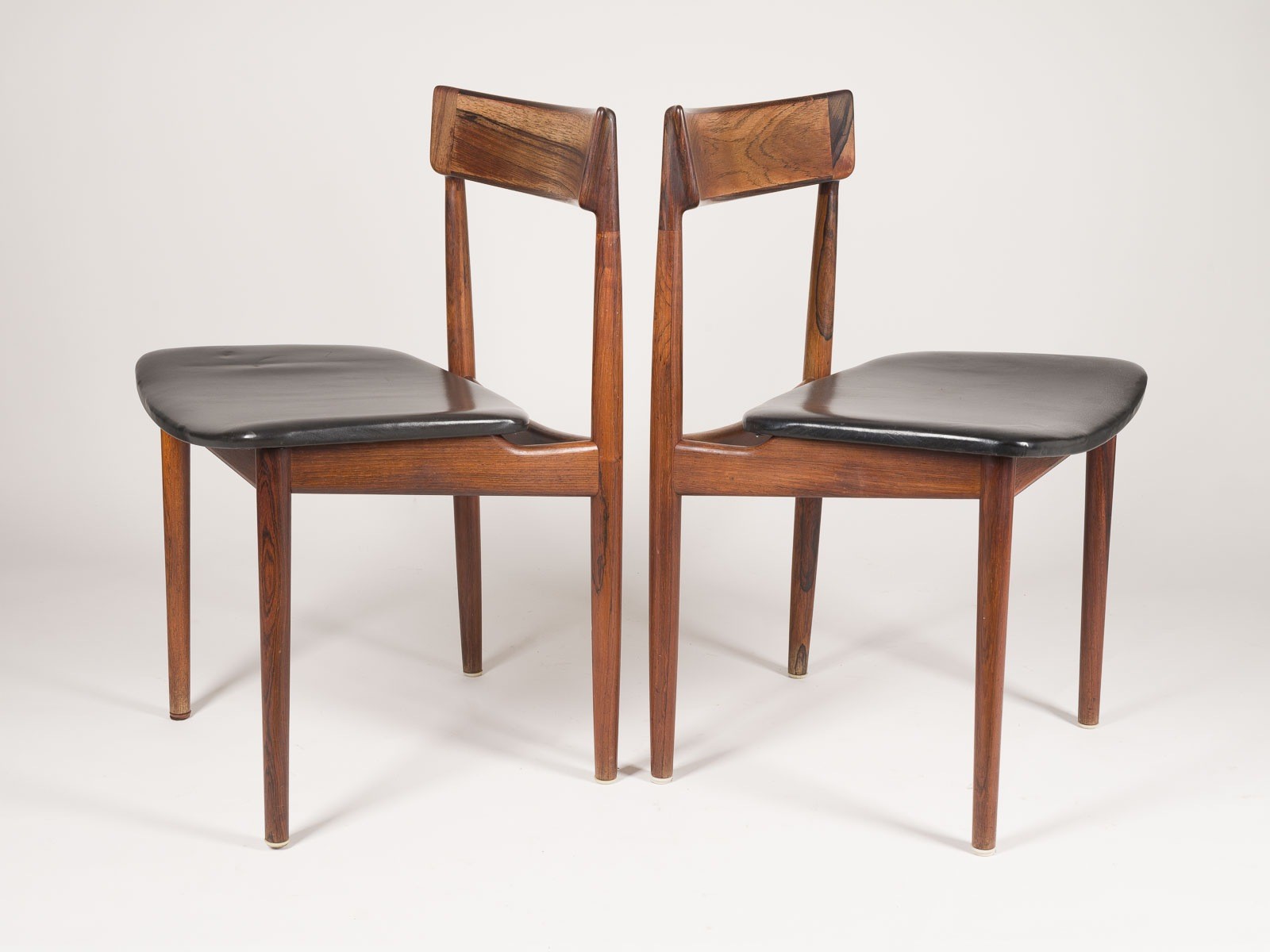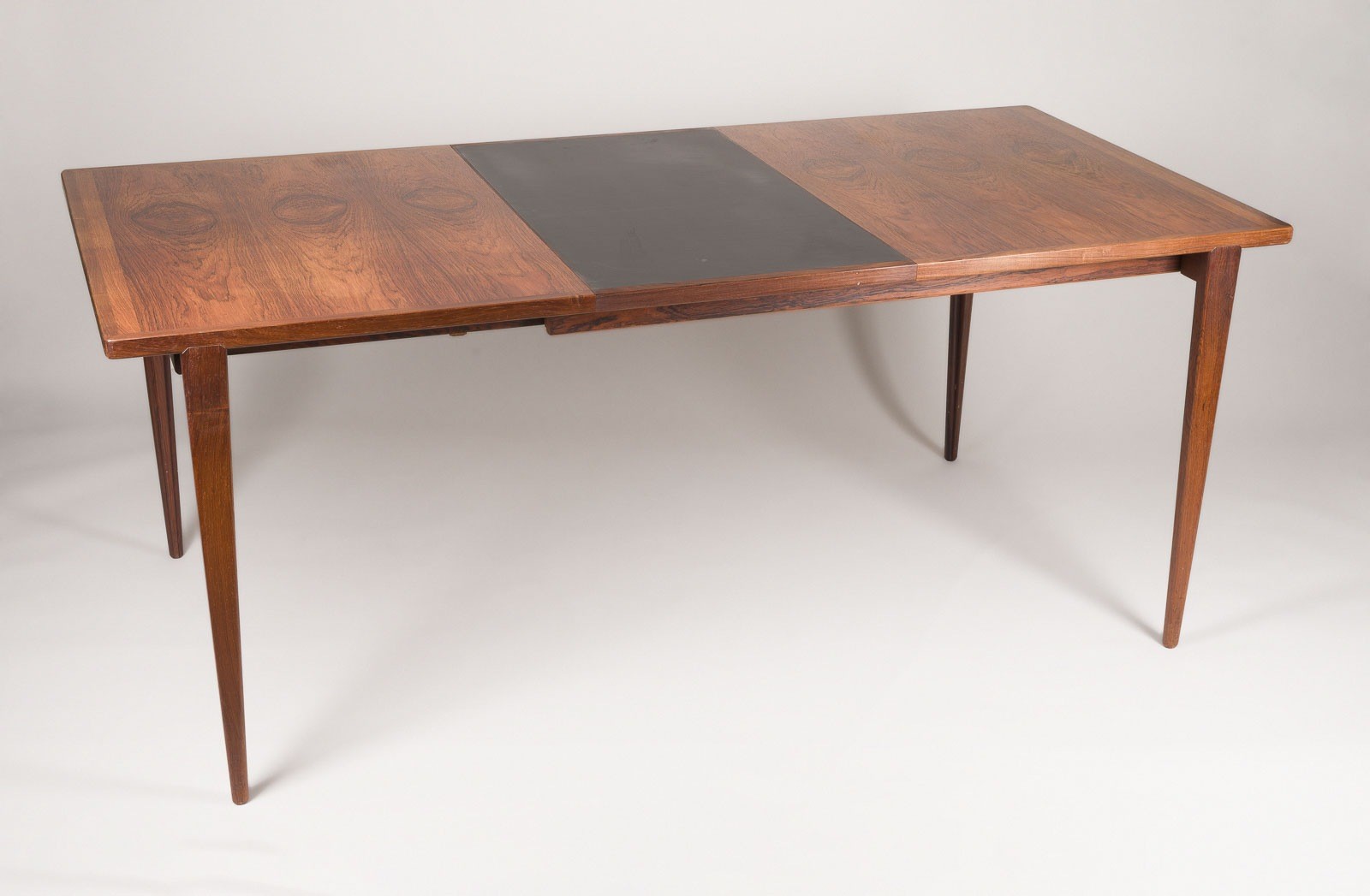 HENRY ROSENGREN HANSEN 1912 - 1974 Denmark DINING TABLE AND SIX CHAIRS MODEL '39' Denmark, Brande Møbelfabrik, design 1960 Rosewood, partly solid, black leather and melamine. H. 76 cm, W. 48 cm, D. 47 cm (chair), H.72 cm W. 130 / 179 / 228 cm, D. 85 cm (dining table). Chairs labelled 'design rosengren hansen' and brand stamp 'Made in Denmark - BM- Brande Møbelindustri'. The table is extendable with two extension leaves. Some age-related signs of use. No in-house shipping available. CITES certificate available. Trade in Dalbergia Nigra rosewood is only permitted within the EU. Export to countries such as the USA, Canada and Great Britain is currently not possible. Please check the import regulations.