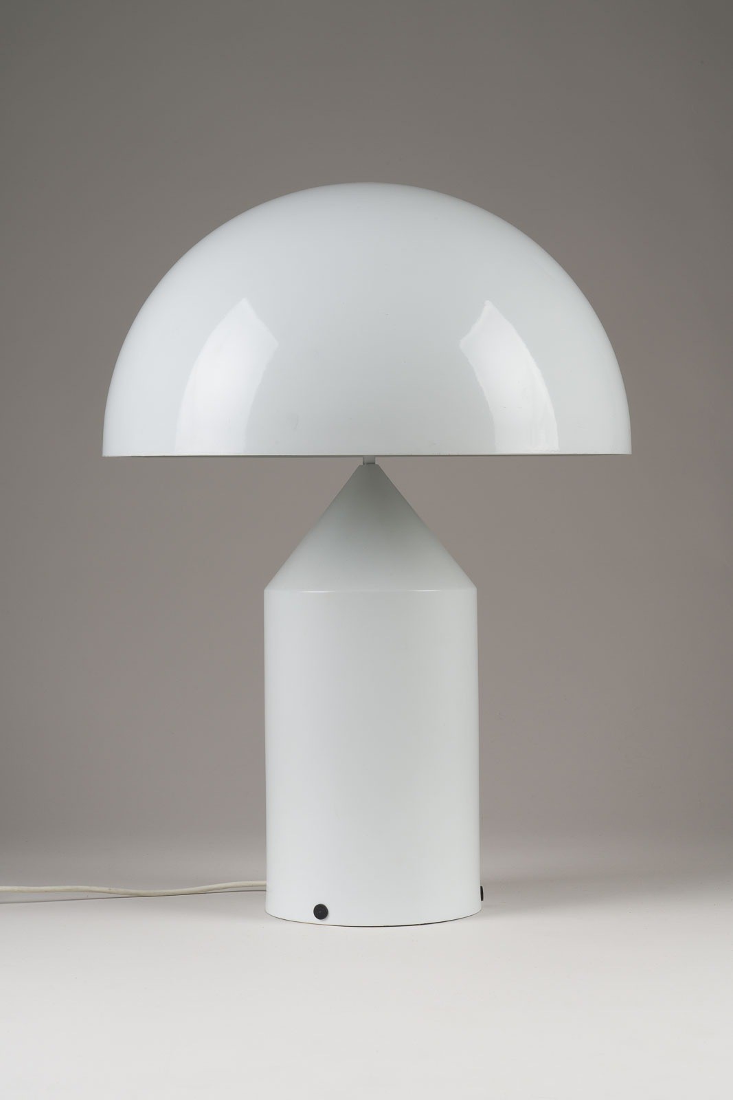 VICO MAGISTRETTI 1920 Milan - 2006 ibid OLUCE 'ATOLLO 233' TABLE LAMP Italy, Oluce, Design 1977 White lacquered metal, double-light electrified, retrofitted w. dimmer, in working condition. H. 70 cm, D. 50 cm. This piece is a first edition of the late 1970s. Slight traces of use, shade min. dam.. No in-house shipping available.