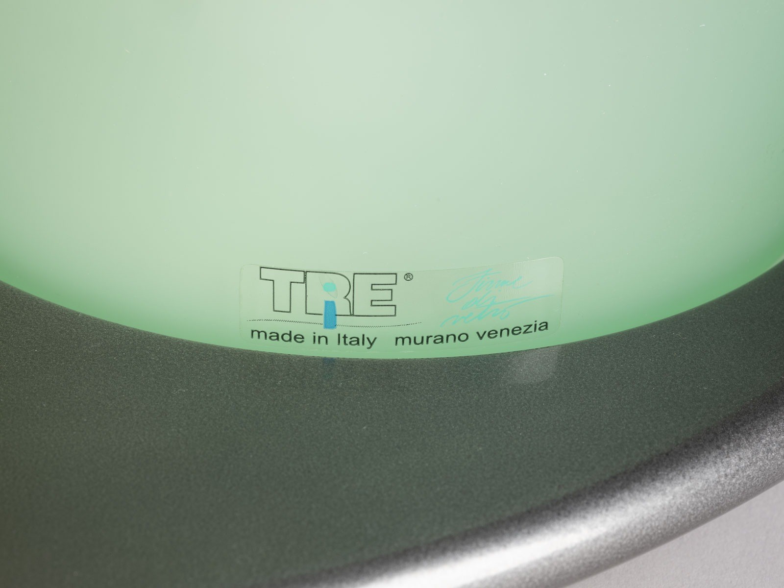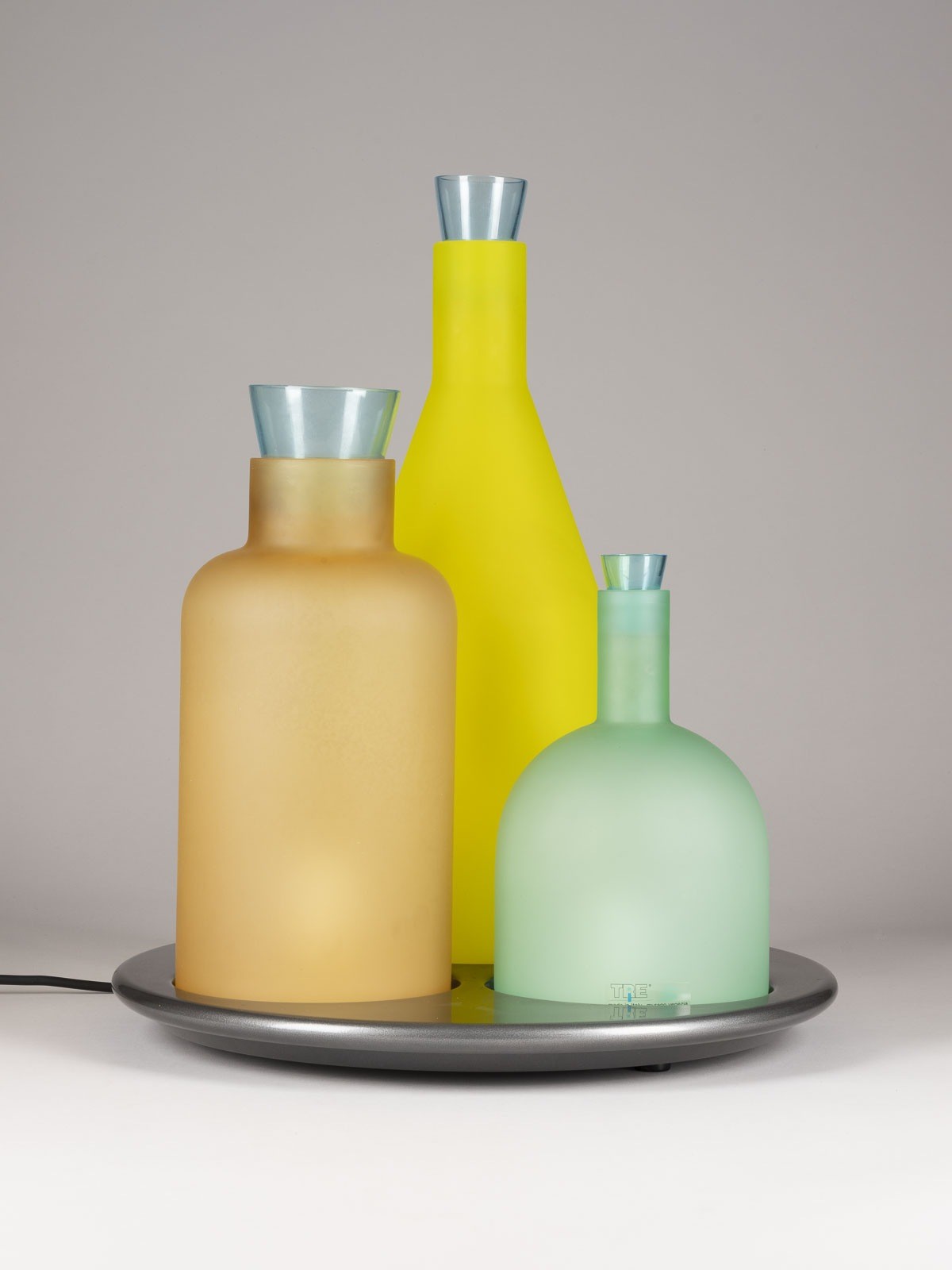 GUIDO ROSATI 1943 TABLE LAMP MODEL 'BACCO 1-2-3' Italy, ITRE Murano, design of 1983 Enamelled metal, bottle-shaped diffusers of coloured glass, 3-light electrified. H. 49 cm, D. 40 cm. Labelled. Minor traces of use, partial scratches on the coating, some tiny scratch marks.