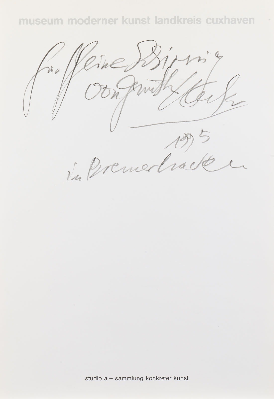 GUENTHER UECKER 1930 Wendorf, Mecklenburg - lives and works in Düsseldorf PORTFOLIO 'EINZELZIMMER (SINGLE ROOM)' (1995) 6 Photographic prints on paper with typographic text on original portfolio. 40 x 27 cm. Signed in pencil and and with personal dedication at the first page. In total 10 pages. Edition 'Museum moderner Kunst Landkreis Cuxhaven, Studio a - Sammlung konkreter Kunst' withouth embossed print. Handling marks, the outer portfolio with scratches and partial staining.