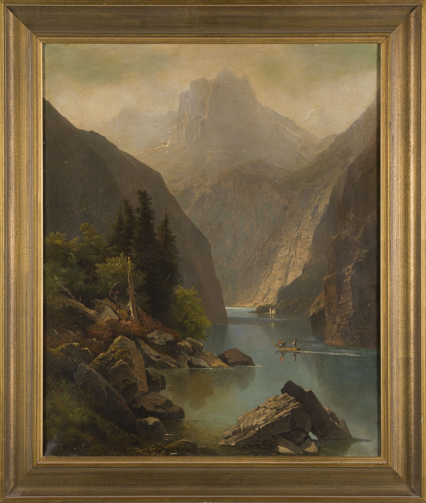CARL PRESTELE 1839 Munich - ? MOUNTAIN LAKE Oil on canvas. 54 × 44 cm (f. 64 × 54 cm). Signed lower left. Paint losses along the lower edge, one retouching. Framed.