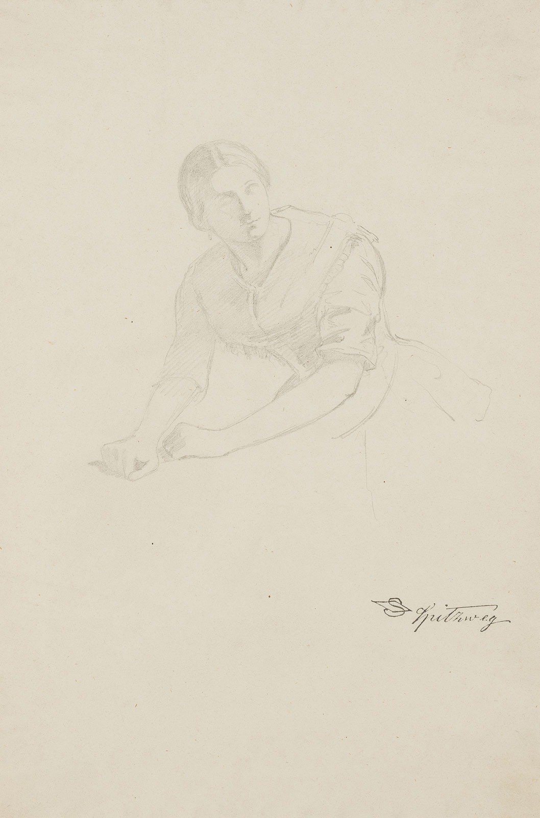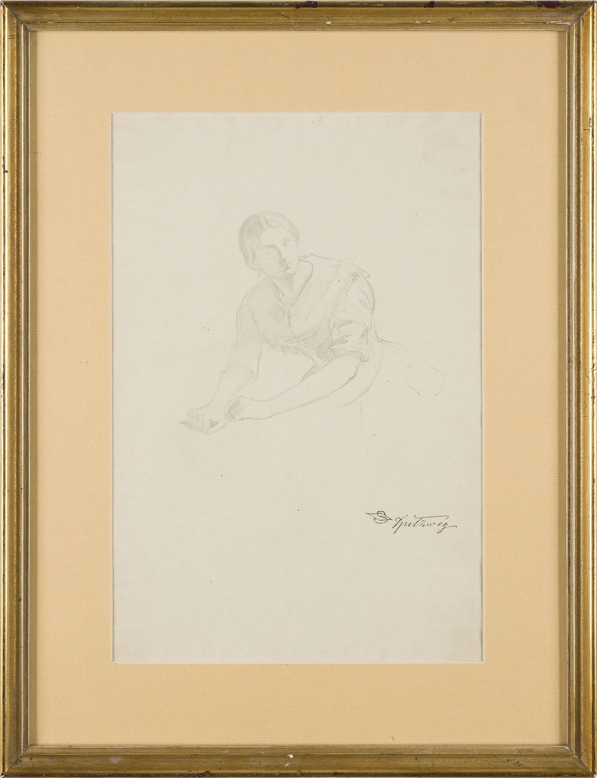 CARL SPITZWEG 1808 Munich - 1885 ibid. BILDNIS EINER FRAU Pencil on paper. Sheet: 33 x 21 cm (f. 42 x 32.5 cm). With signature stamp lower right. Verso: later number in pencil in the lower corner. Framed under glass in a passe-partout. Provenance: Private collection, Southern Germany.
