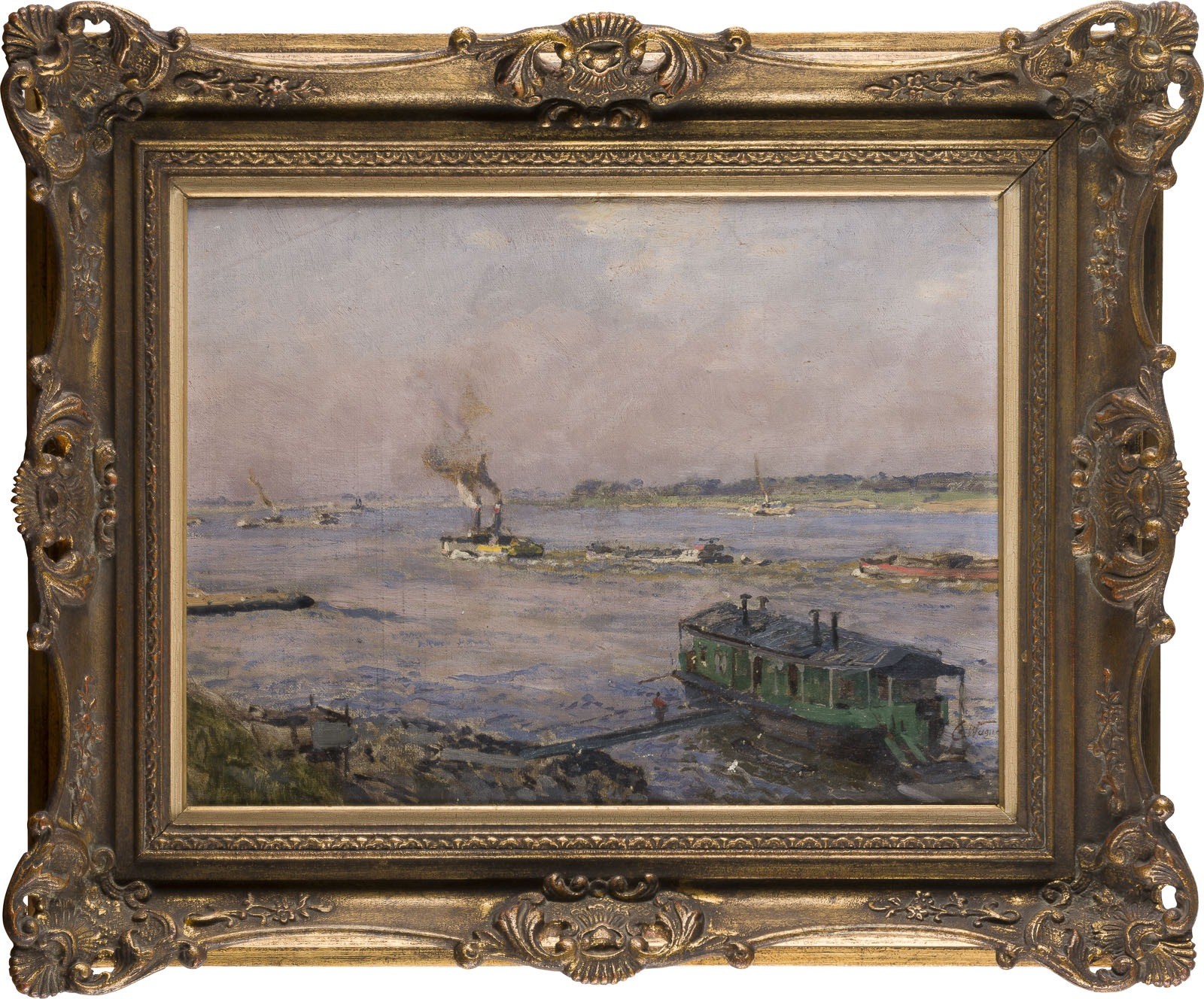 CORNELIUS WAGNER 1870 Dresden - 1956 Socking THE RHINE ON A FINE DAY Oil on canvas. 32 x 46 cm (f. 50 x 61 cm). Signed lower right. Framed.