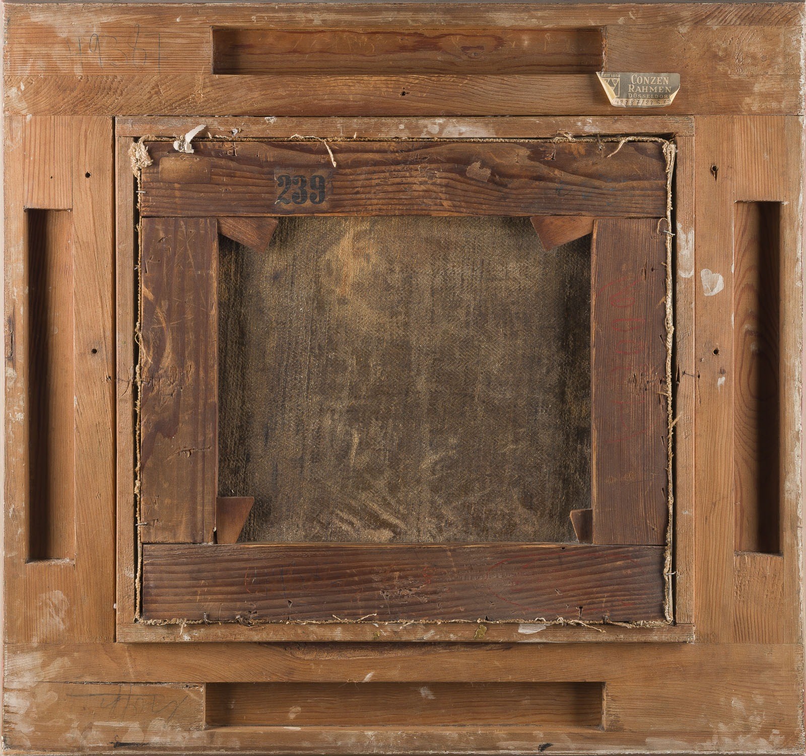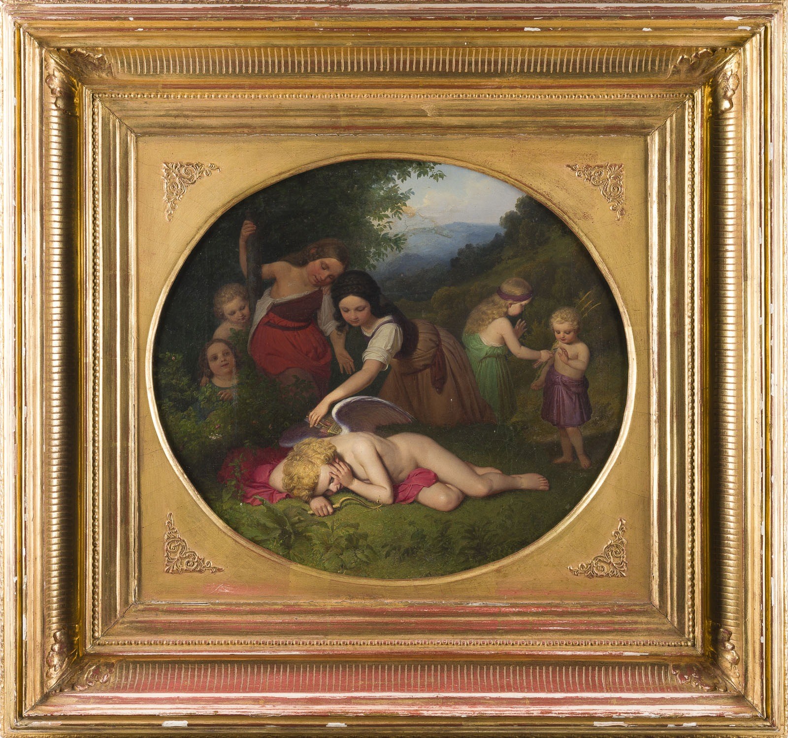 CARL GOTTFRIED PFANNSCHMID 1818 Muhlhausen - 1887 Berlin The Disarming of Cupid, 1841 Oil on canvas, relined. 41.5 x 45 cm (f. 66 x 71 cm). Signed and dated lower right. Verso: number label "239". Restored. Frame (label: "Conzen Rahmen, Dusseldorf"). The work presents a romantic variation of the allegorical subject "The Disarming of Cupid", replacing the traditional Graces with a group of children. Conceived as a genre-like composition, the scene reflects the sentimental and lyrical sensibility characteristic of Romantic painting of the 19th century. The children symbolize innocence, purity, and naturalness. Cupid is not depicted asleep but appears awake and tense, as if reacting with surprise or unease to the unfolding scene. The composition is clearly structured and articulated in several spatial planes. The artist's painterly skill is particularly evident in the delicate rendering of flesh tones and the careful treatment of drapery, attesting to his academic training. Carl Gottfried Pfannschmidt was a prominent representative of academic historical and religious painting. In 1855 he was appointed a full member of the Royal Academy of Arts in Berlin, received the title of Professor in 1860, and from 1865 taught composition and drapery. He gained recognition especially through his involvement in major monumental projects, including work at the Altes Museum and Neues Museum in Berlin, the Charlottenburg Mausoleum, the Schwerin Palace Church, as well as numerous altarpieces for churches throughout Germany. Provenance: Private collection.