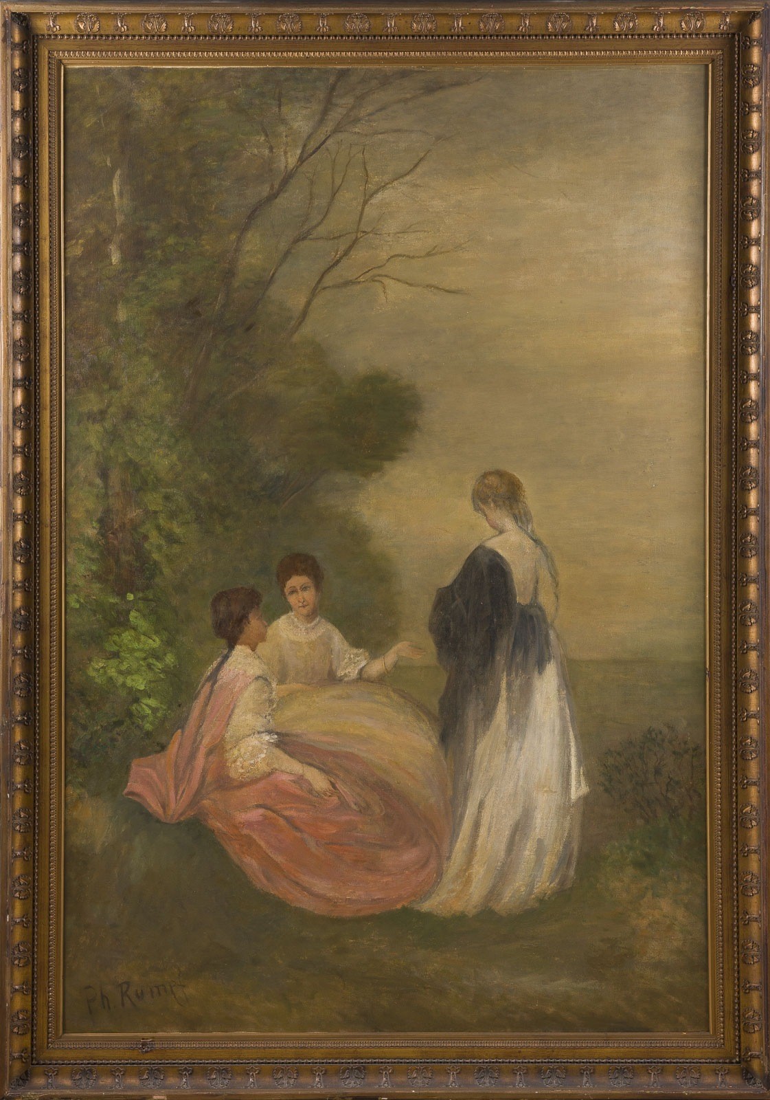 PHILIPP RUMPF 1821 Frankfurt a. M. - 1896 THREE LADIES IN A LANDSCAPE Oil on canvas, double. 146 x 100 cm (f. 164 x 116 cm). Signed lower right. Extensive retouching. Framed.