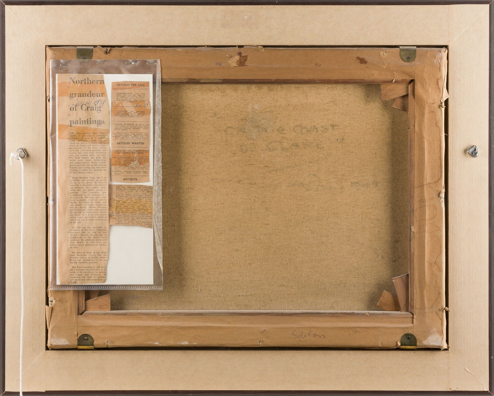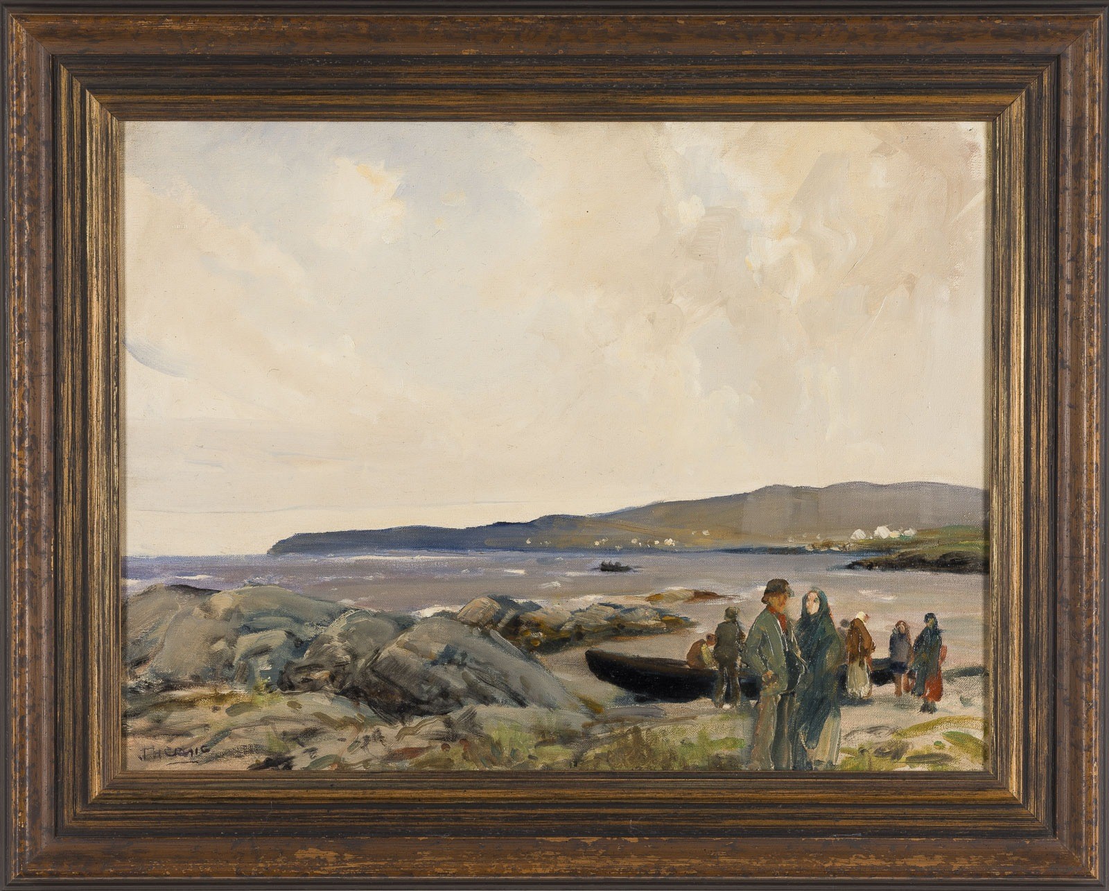 JAMES HUMBERT CRAIG 1878 Belfast - 1944 HARBOUR SCENE IN CUSHENDUN, circa 1930 Oil on canvas. 38.5 x 50.5 cm (f. 51 x 64 cm). Signed lower left. Verso: indistinct pencil inscription. Accompanied by a newspaper clipping featuring an advertisement in English offering a painting corresponding to the present work; the clipping is handwritten dated 1975. Frame. Provenance: Private Collection, from the same collection as Lot 2612.