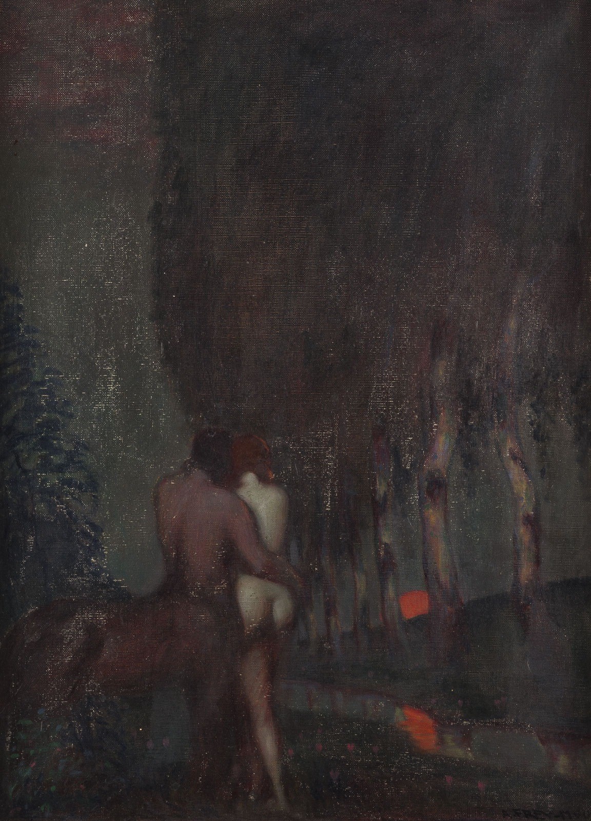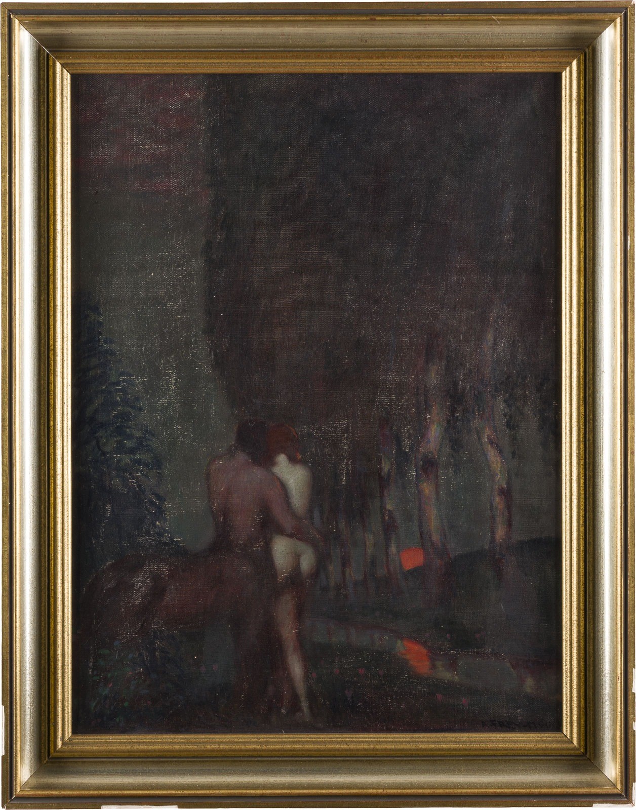ADOLF FREY-MOOCK 1881 Jona - 1954 Egnach CENTAUR WITH NYMPH AT SUNSET Oil on canvas. 62 x 47 cm (f. 71 x 56 cm). Signed lower right. Framed.