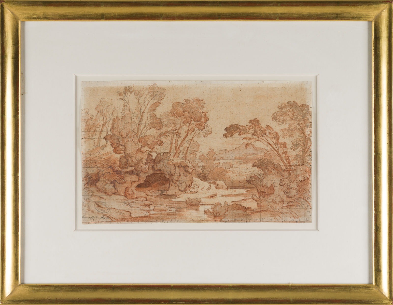 ANDREAS ACHENBACH 1815 Kassel - 1910 Dusseldorf LANDSCAPE NEAR ROME Red chalk and watercolor over pencil on paper. 18.7 x 30.3 cm (f. 39.5 x 51 cm). Lower right with oval estate stamps and the inscription "1845 Rome". Spotted. Framed under glass.