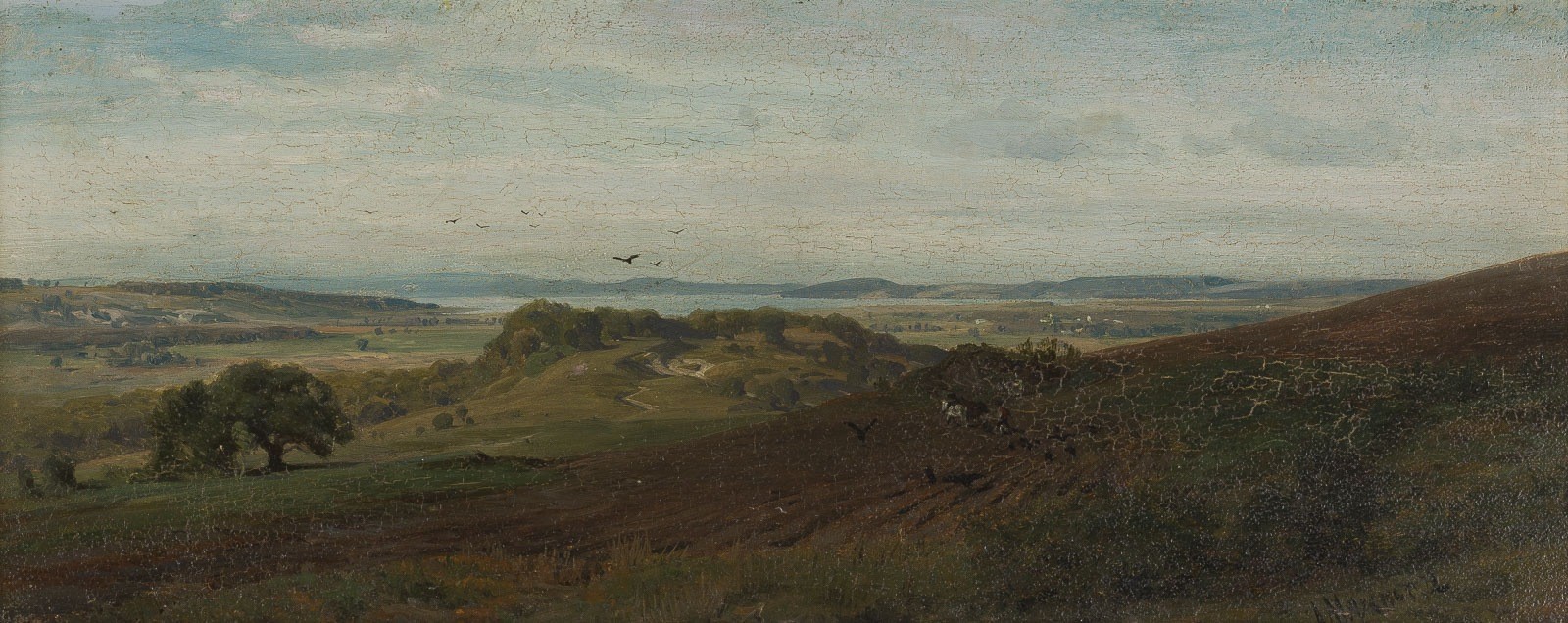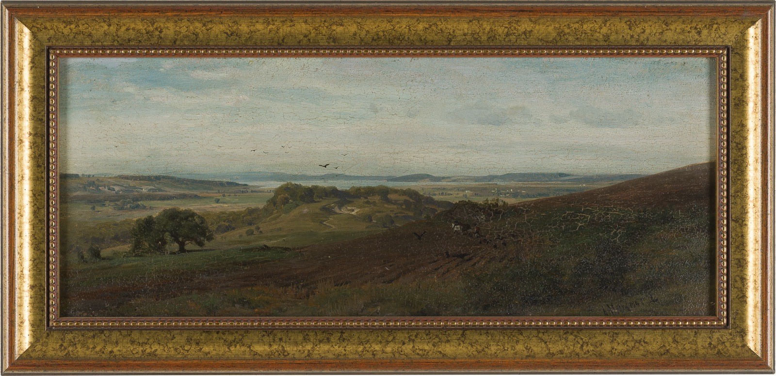 GERMAN SCHOOL OF THE SECOND HALF OF THE 19TH CENTURY LANDSCAPE WITH FIELD AND LAKE, 1872 Oil on wood. 14 x 35 cm (f. 19 x 39.5 cm). Signed and dated lower right. Framed. Provenance: Estate of the Kaiser family.