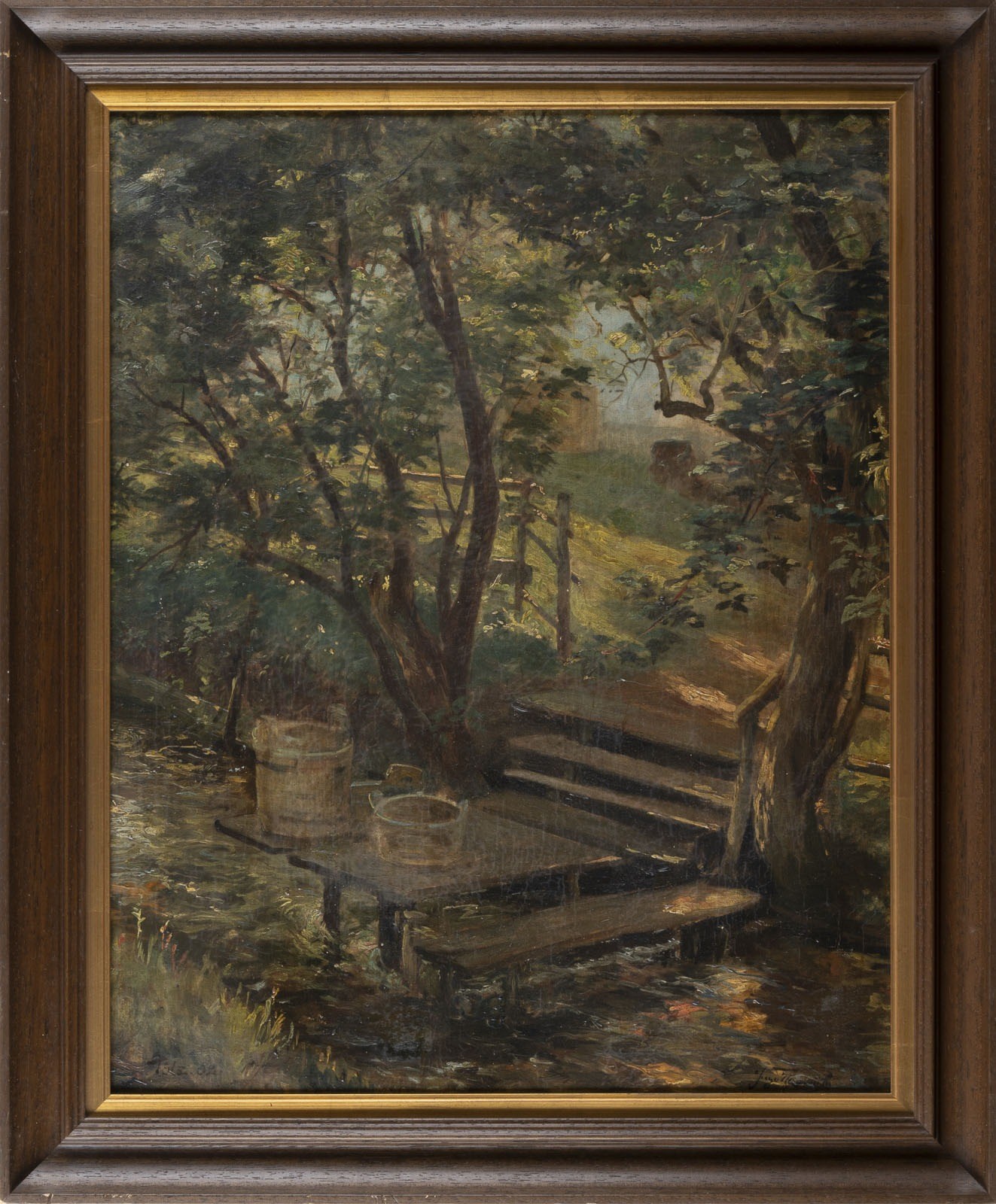 GERMAN SCHOOL Late 19th / Early 20th century LANDSCAPE WITH BUCKETS ON THE BRIDGES, 1902 Oil on canvas. 62 × 50 cm (f. 71.5 × 59 cm). Signed lower right, indistinct. Framed.