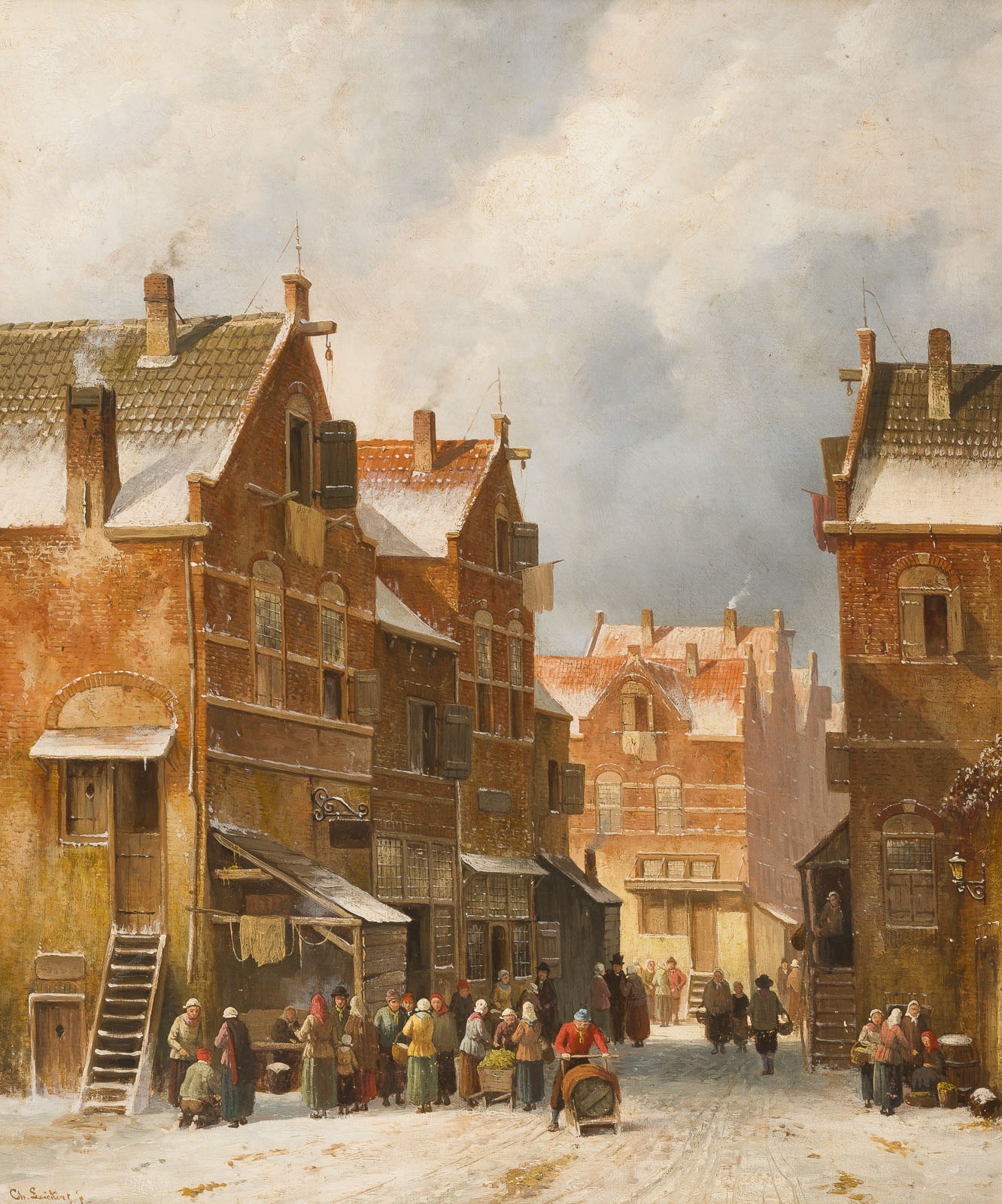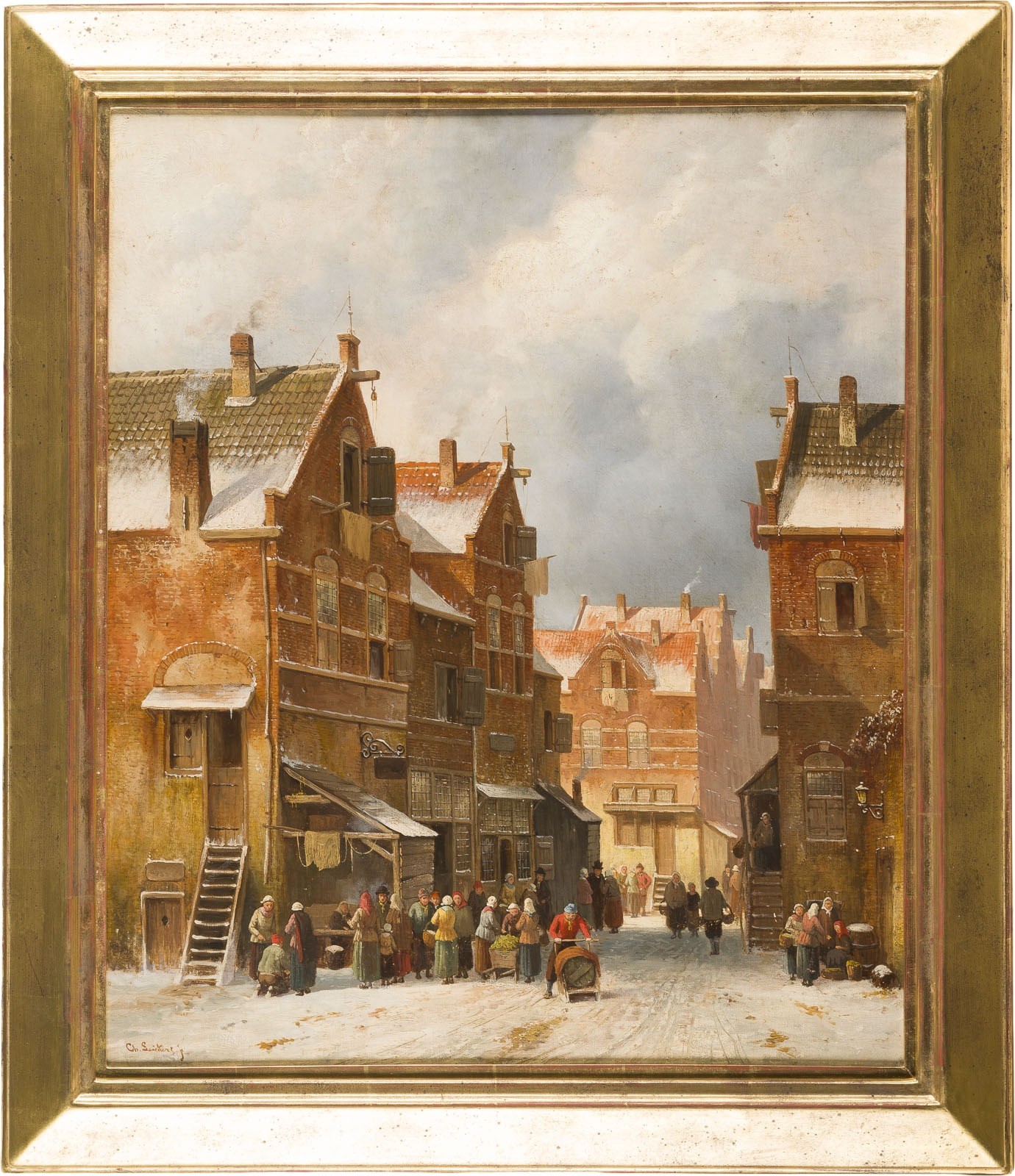 CHARLES LEICKERT 1818, Brussels - 1907, Mainz MARKET DAY IN A SNOW-COVERED CITY Oil on panel. 62 x 51 cm (f. 71 x 62 cm). Signed lower left "Ch. Leickert f." Verso: gallery label. Framed.