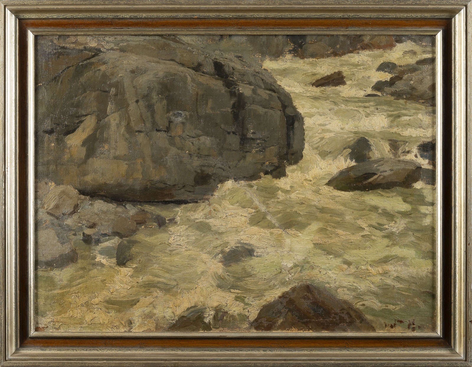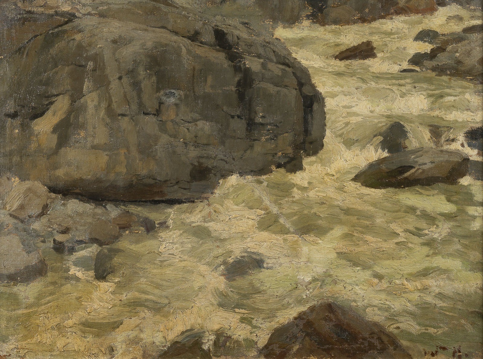 WILLY HAMACHER 1865, Breslau - 1909, Bad Reinerz OIL STUDY OF THE ROCKY COAST Oil on canvas mounted on hardboard, 39 x 52 cm (F. 47 x 59 cm). Monogrammed lower right. Paint losses and retouching. Frame.
