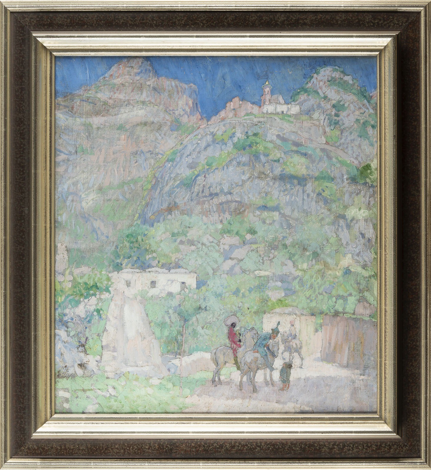 CARL PLÜCKEBAUM 1880 Düsseldorf - 1952 ibid. POSITANO, THE PATH TO THE MOUNTAIN CHAPEL. circa 1910s Oil on canvas, relined. 59 × 53 cm (f. 76 × 70 cm). Monogrammed and inscribed with the location lower left. Framed. A sun-drenched southern landscape rendered in a light, pointillist manner. Were it not for the characteristic "Pl" monogram in the lower left corner, one would scarcely suspect that this is a work by the Düsseldorf painter Carl Plückebaum, who is best known for his fairy-tale scenes featuring small gnomes and sprites that so often evoke the atmosphere of Christmas or Easter. This painting, however, is among the great rarities in his oeuvre and clearly demonstrates that Plückebaum's artistic talent extended far beyond subject matter shaped by public demand. Provenance: Private collection.