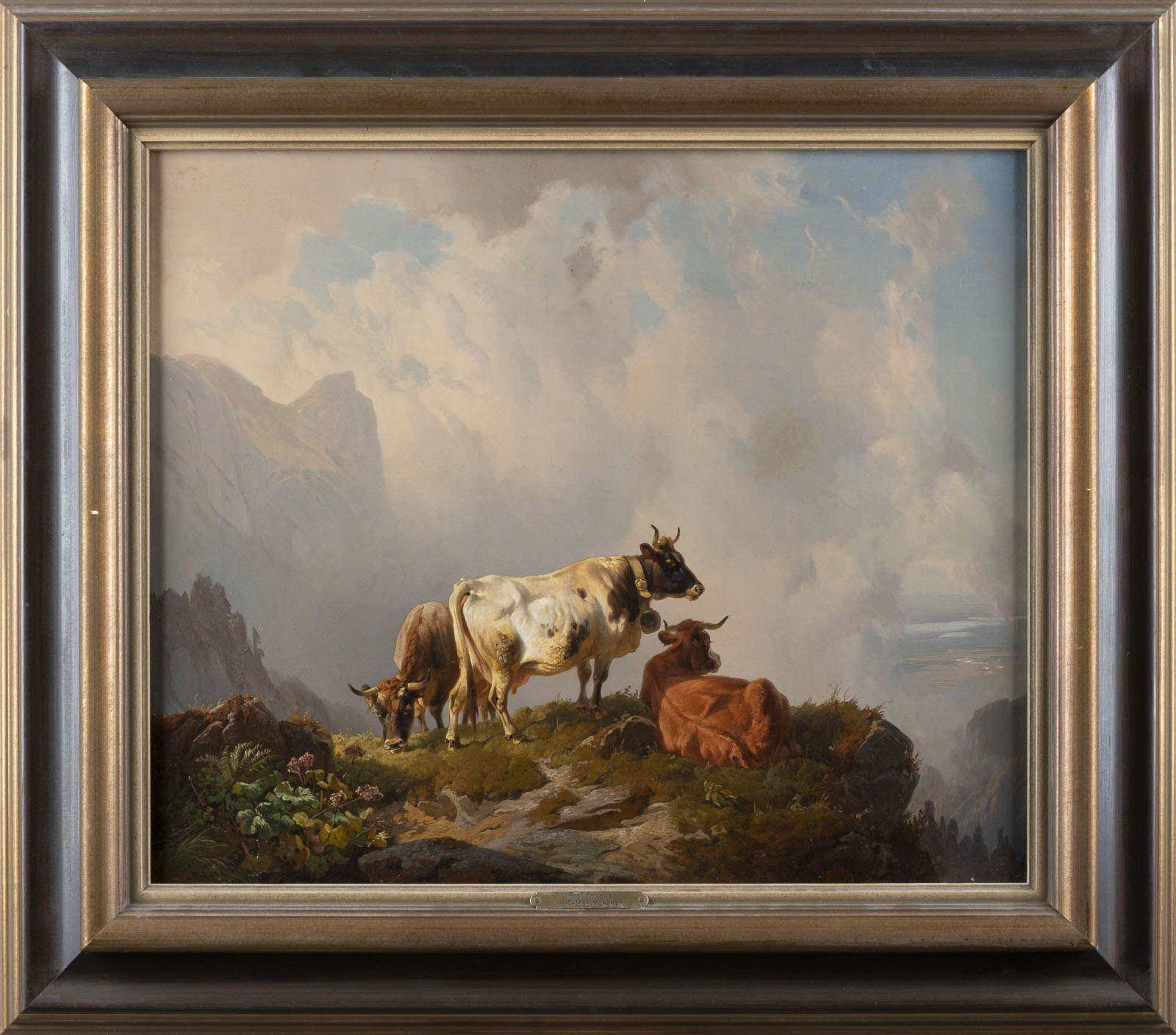 FRIEDRICH VOLTZ 1817 Nordlingen - 1886 Munich CATTLE BEFORE A MOUNTAIN LANDSCAPE, 1850 Oil on canvas, 42 x 50 cm (f. 58 x 66 cm). Signed and dated lower right. Framed.