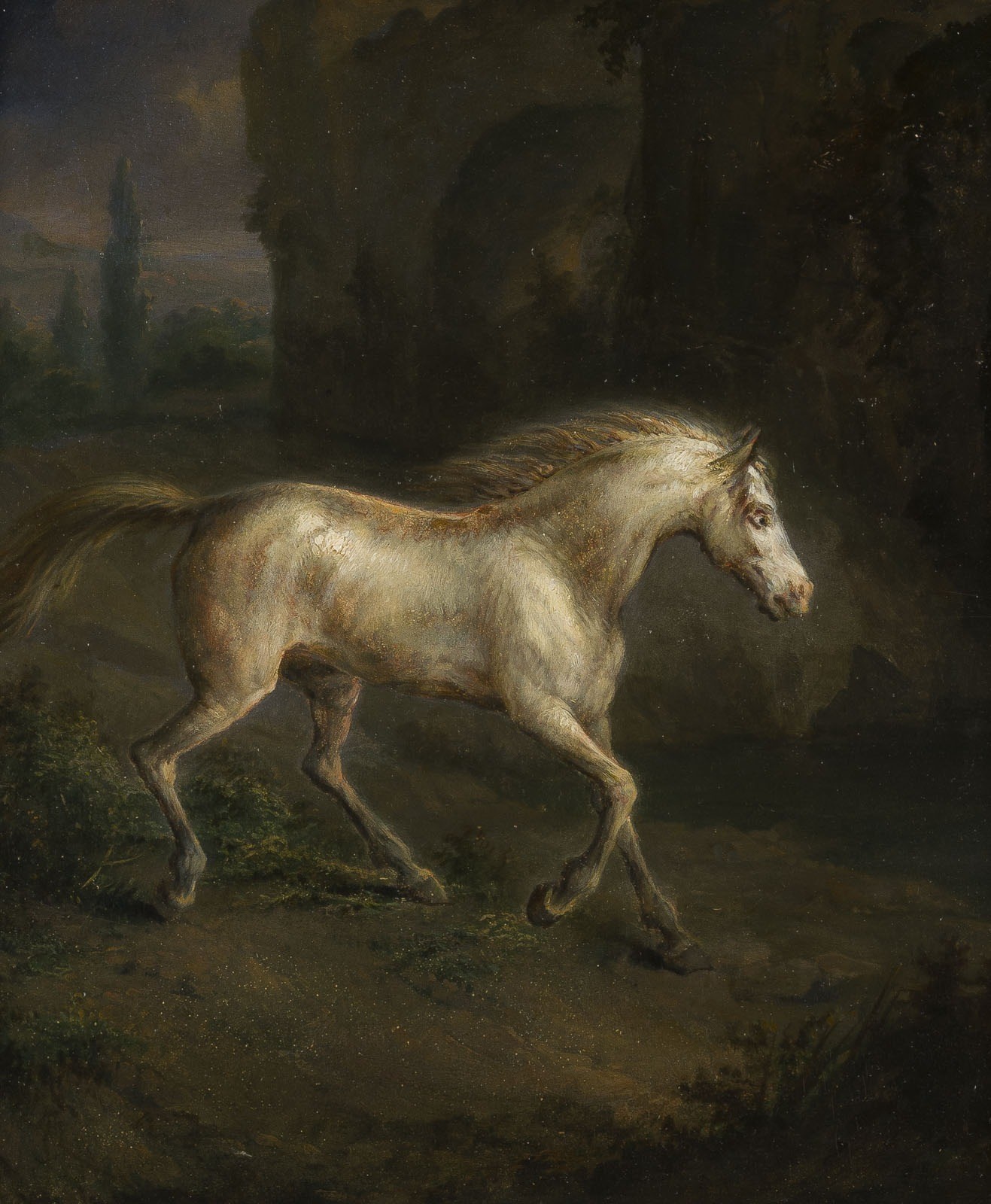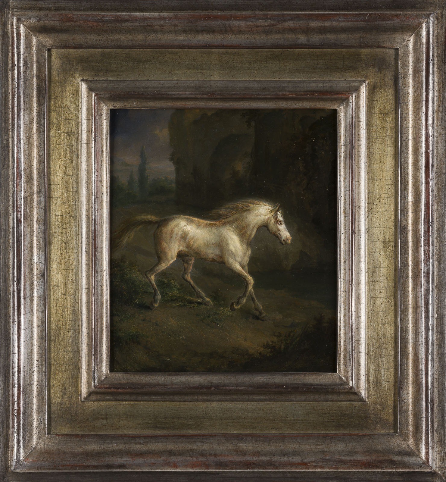 PIETER FREDERICK VAN OS (attr.) 1808, Amsterdam - 1892, Haarlem WHITE HORSE IN A LANDSCAPE Oil on panel. 27.5 x 24 cm (f. 49 x 45.5 cm). Verso: old pen inscription "P. F. van Os 1872". Framed.
