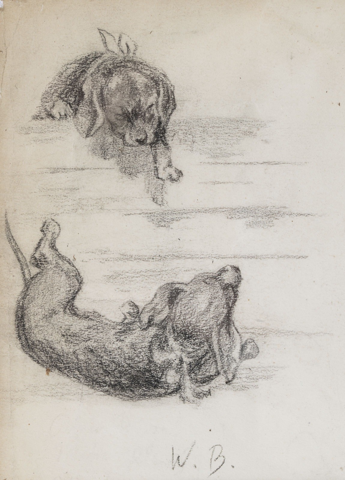 WILHELM BUSCH 1832 Wiedensahl - 1908 Mechtshausen SKETCH WITH TWO DACHSHUNDS Charcoal on paper, mounted on paper. 17.5 x 13 cm (f. 22 x 18.5 cm). Monogrammed lower edge "W.B." Lightly browned, rubbed at the edges. Framed.