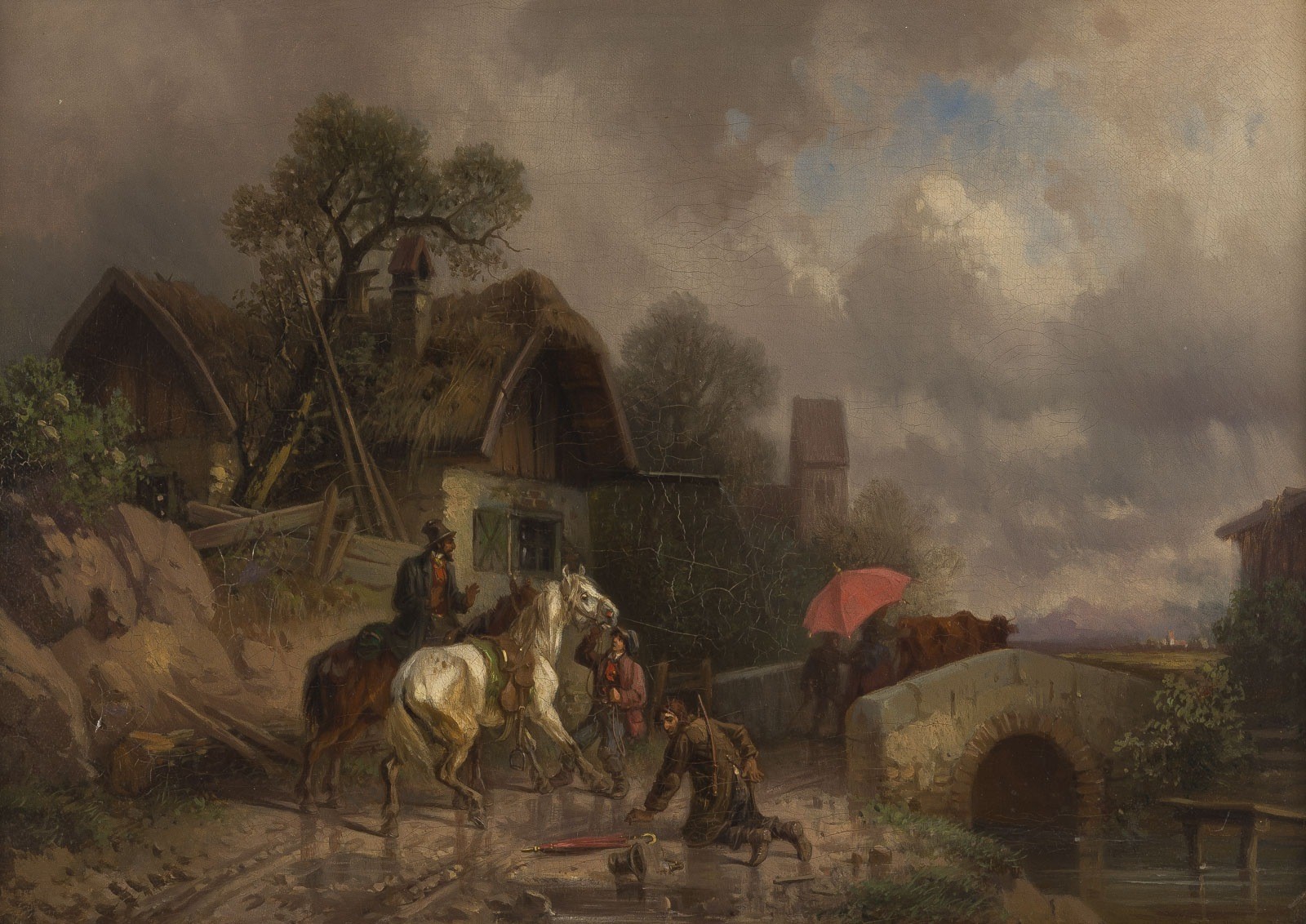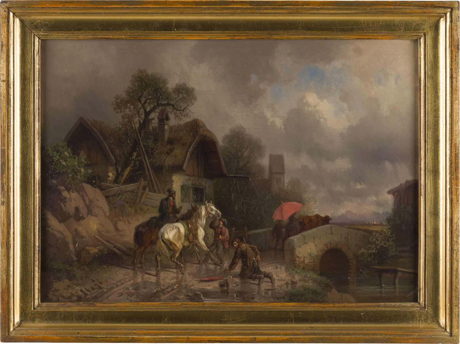 ADOLF SCHMIDT 1827 Dresden - 1880 Munich STREET SCENE WITH HORSES FRIGHTENED BY A THUNDERSTORM Oil on canvas, relined. 33 x 46 cm (f. 40 x 35.5 cm). Signed lower right: "Ad. Schmidt Munchen". Framed. Provenance: Private collection.