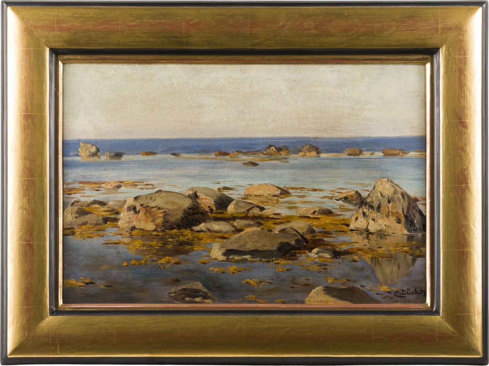 EUGEN GUSTAV DÜCKER 1841 Ahrensburg - 1916 Düsseldorf STUDY OF A ROCKY COAST Oil on cardboard. 33 × 47 cm (f: 45 × 49.5 cm). Signed lower right. Framed.