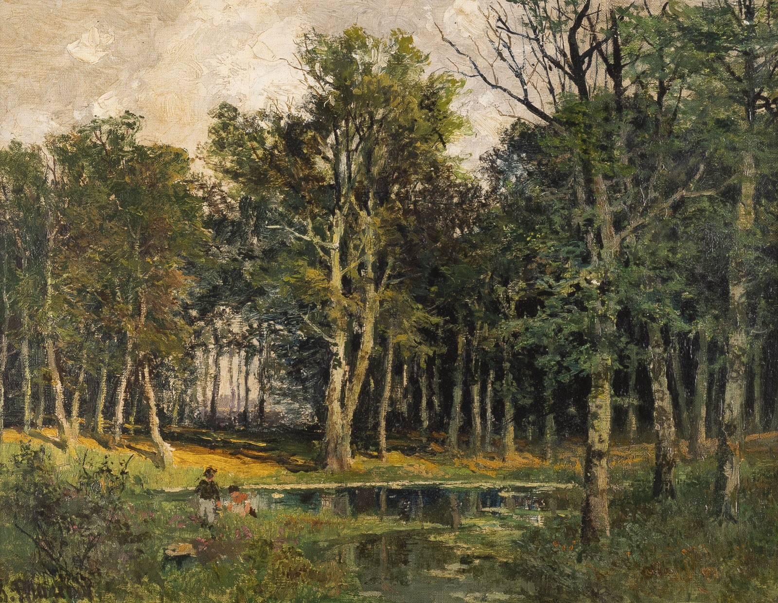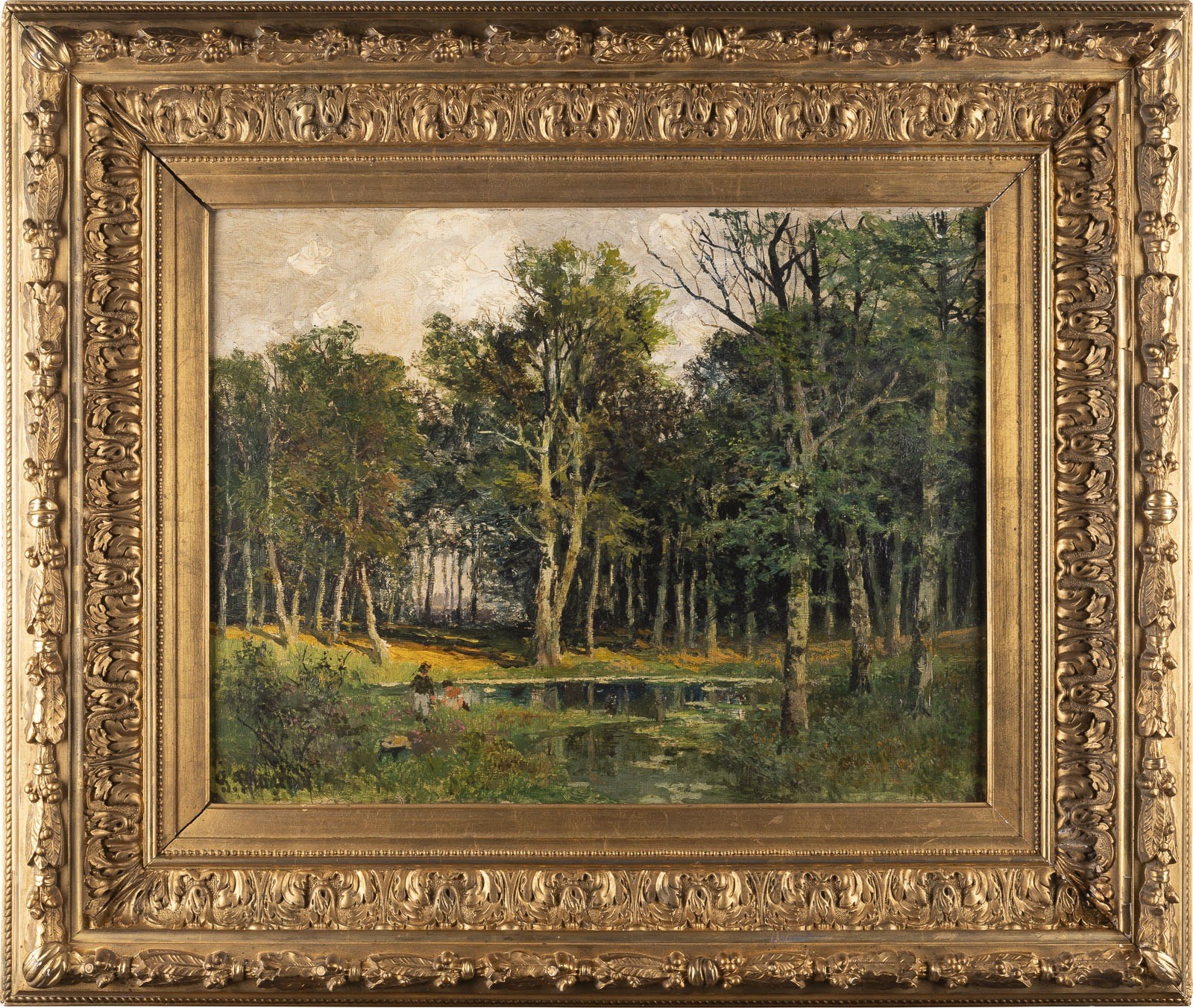 GUSTAV PFLUGRADT 1829 Franzenberg - 1907 Berlin WALDSEE Oil on canvas. 37 x 48 cm (F. 59.5 x 70 cm). Signed bottom left. Verso: round stamp with a lion and an unreadable inscription. Retouching on the left tree. Frame.