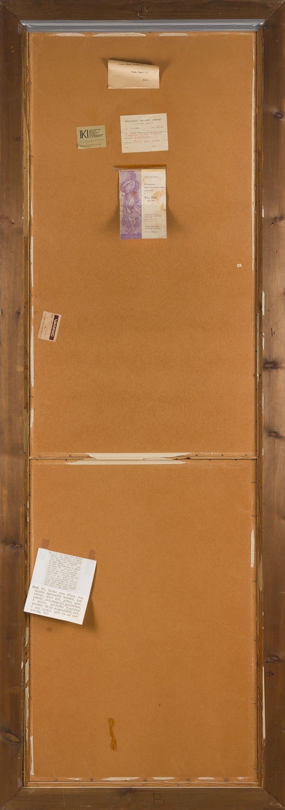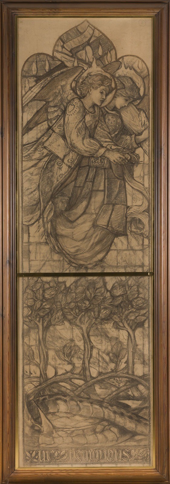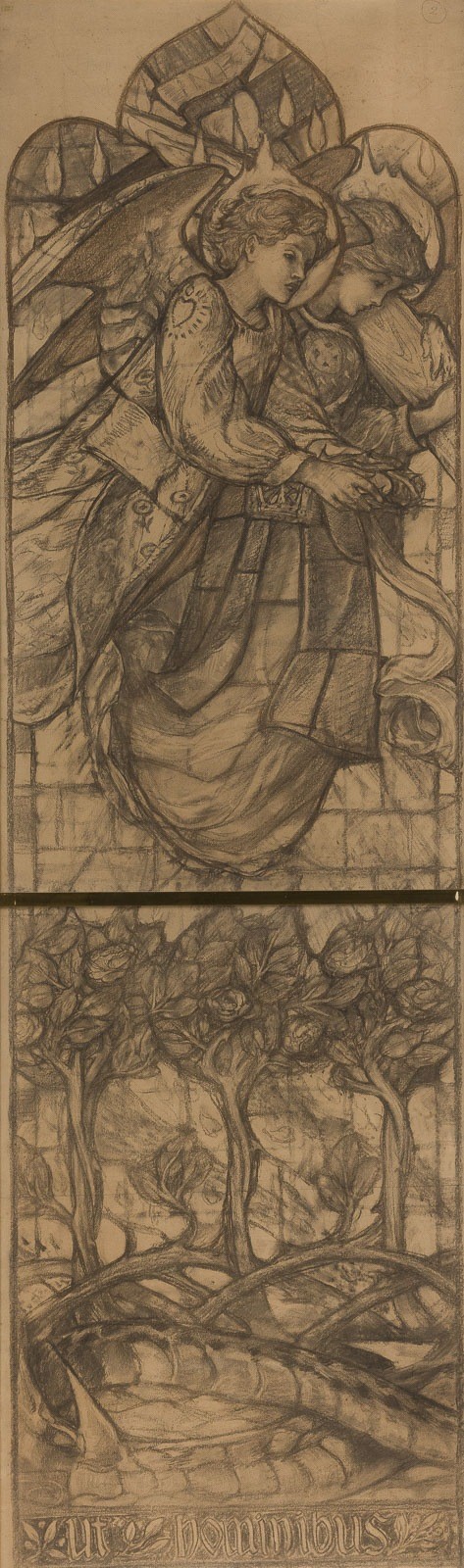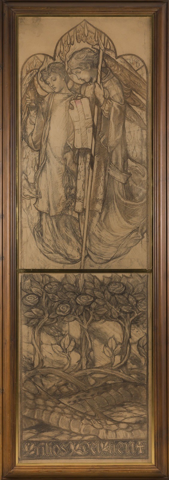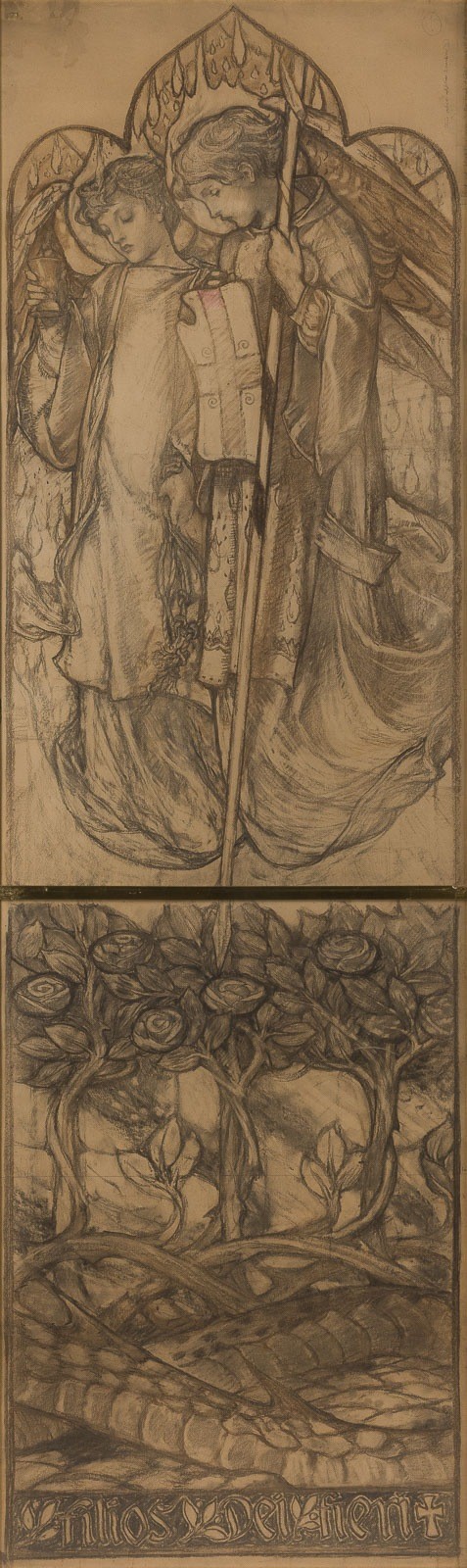 LOUIS DAVIS 1861-1941 TWO STUDIES FOR A STAINED GLASS WINDOW FOR ST. ANSELM'S CHURCH Chalk on paper. Approx. 204 × 61 cm (f. 220 × 78.5 cm). Verso with exhibition labels: Maltzahn Gallery Limited, London, Filius Dei Fieri; Maisons Yard Gallery, London, An Exhibition of Stained Glass Window Designs and Drawings by Louis Davis; Internationaler Markt für aktuelle Kunst, Düsseldorf, 1974. Slightly browned. Framed under glass (unopened). The present studies are related to works by Louis Davis created for St. Anselm's Church in Hatch End, Middlesex, England. Louis Davis was an important British watercolourist, illustrator, and stained glass artist, closely associated with the Arts and Crafts movement. He is regarded as one of the leading figures in British stained glass of his time and was often referred to as 'the last of the Pre-Raphaelites.' For St. Anselm's Church, Davis designed and executed several stained glass windows, including representations of angels. Comparable designs and preparatory studies for these window cycles are today held, among other collections, in the William Morris Gallery. Provenance: Private collection.