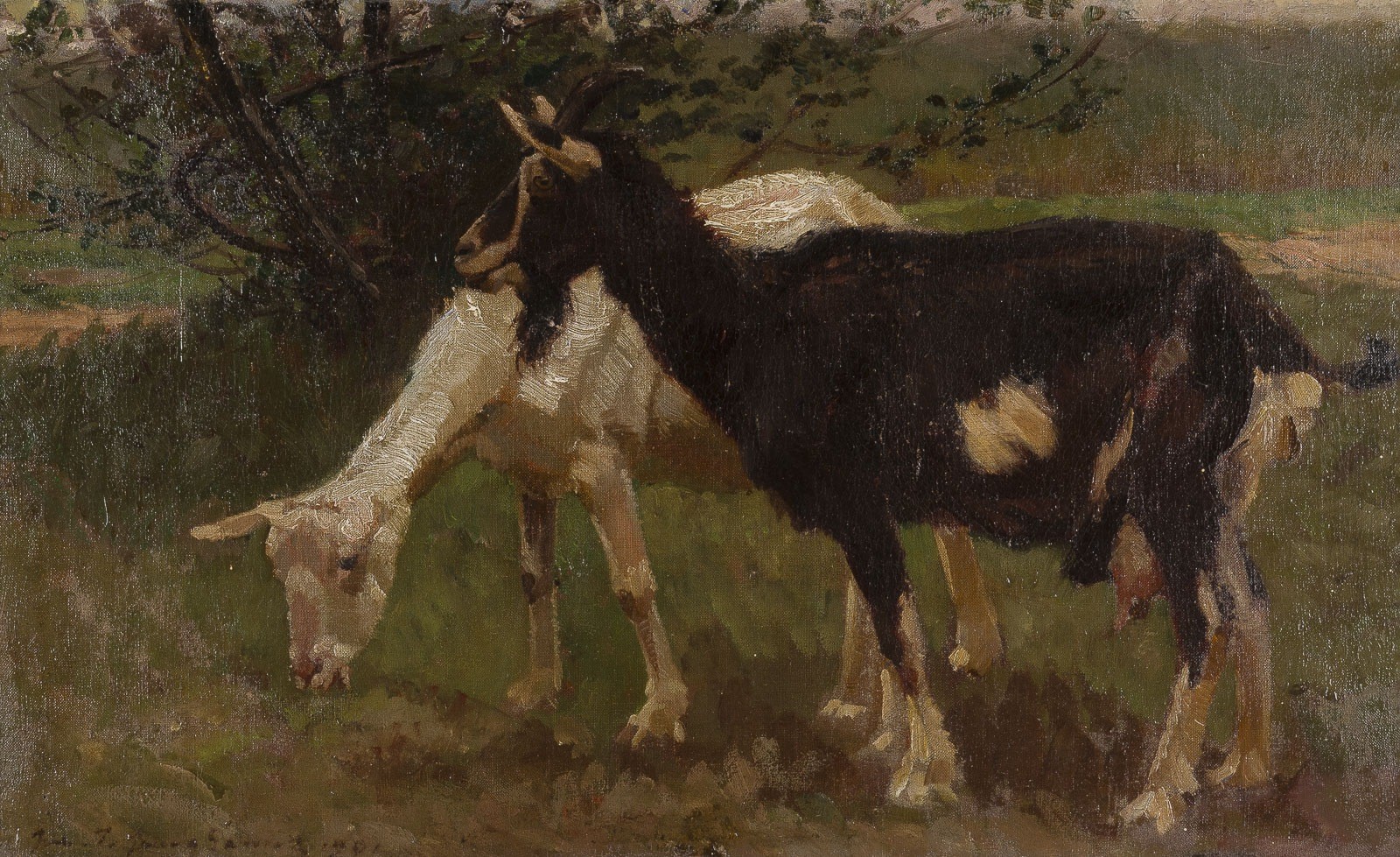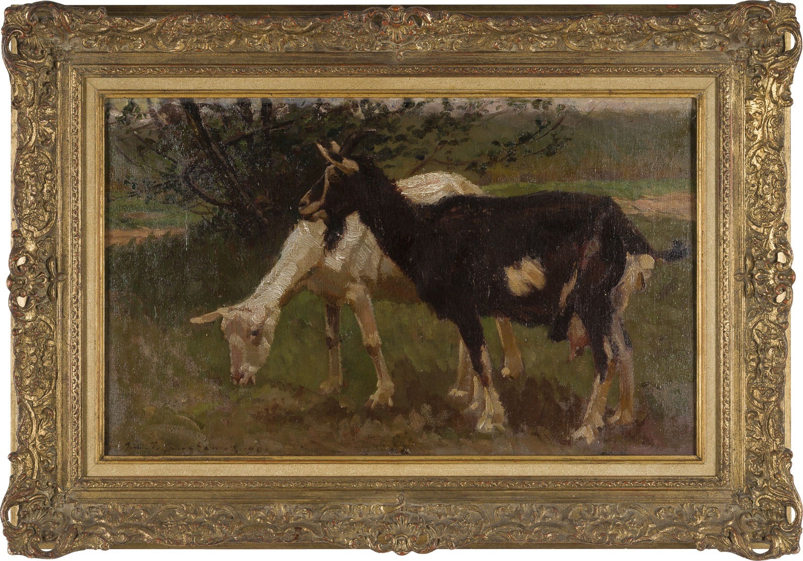 JULIUS PAUL JUNGHANNS 1876 Vienna - 1958 Dusseldorf TWO GOATS, 1901 Oil on canvas. 40 x 65 cm (f. 58 x 83 cm). Signed and dated lower left. Verso: Ownership label. Framed. Provenance: Estate of the Kaiser family.