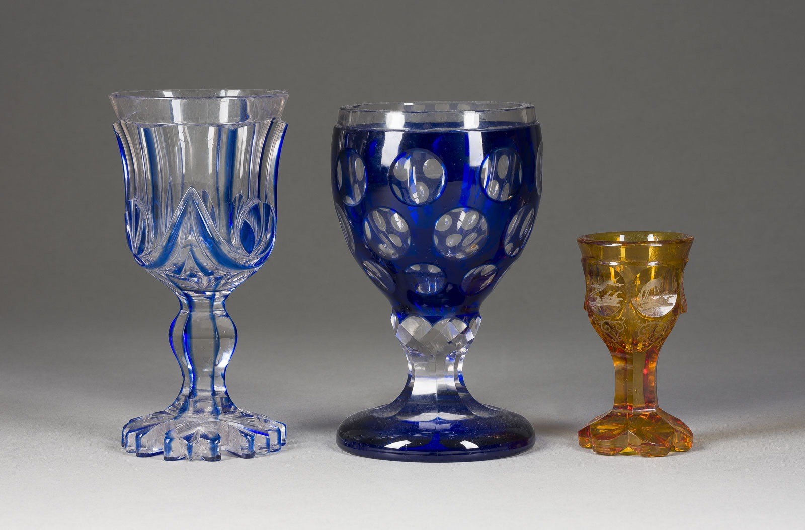 Farbloses Glas mit kobaltblauem und bernsteinfarbenem Überfang, geschliffen, mattgeschnitten. H. 10-17 cm. Min. Alterungsspuren.