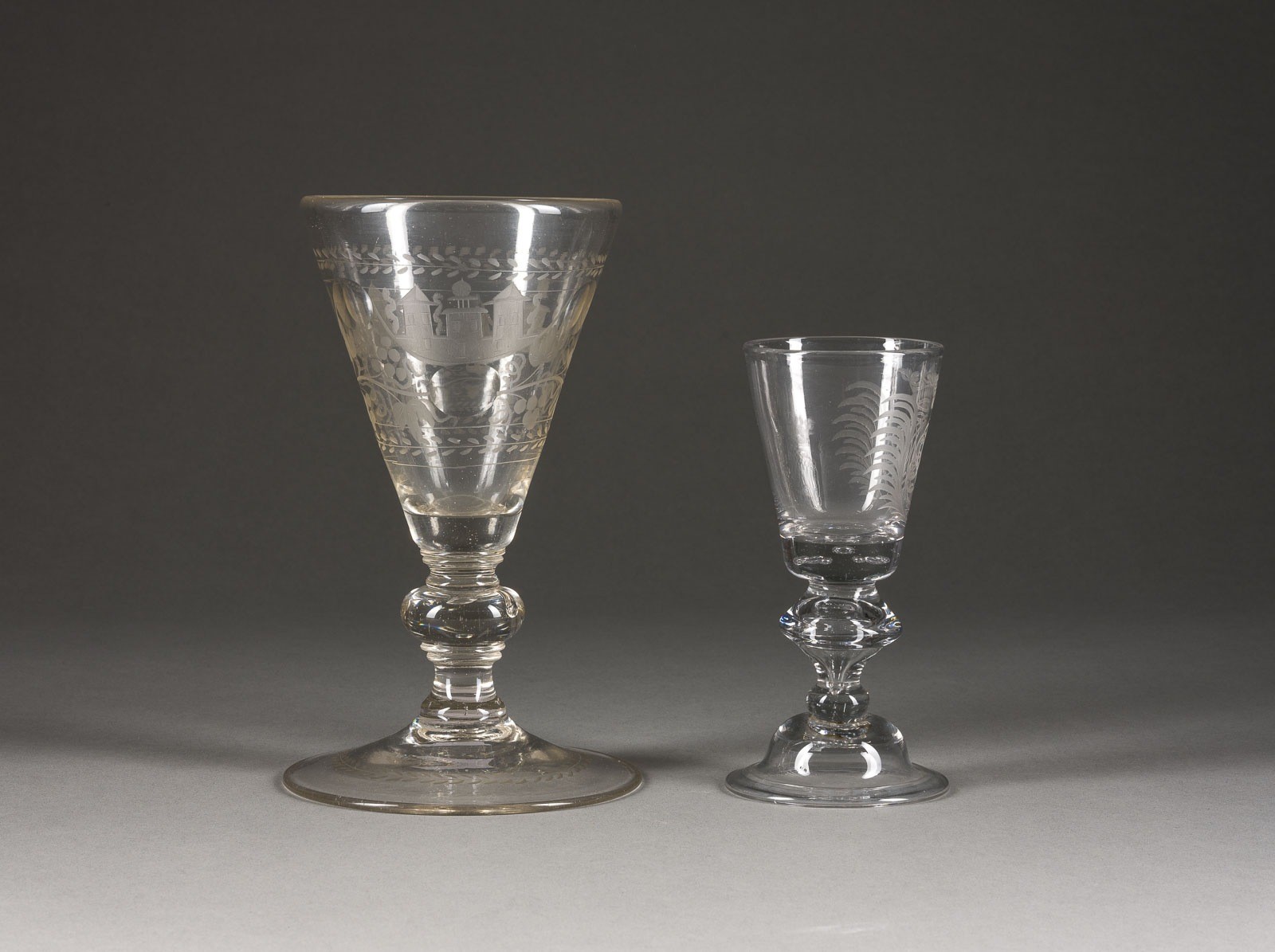 Farbloses Glas, geschliffen, geschnitten. H. 16-20,5 cm. Bekröntes Monogramm 'MM'.