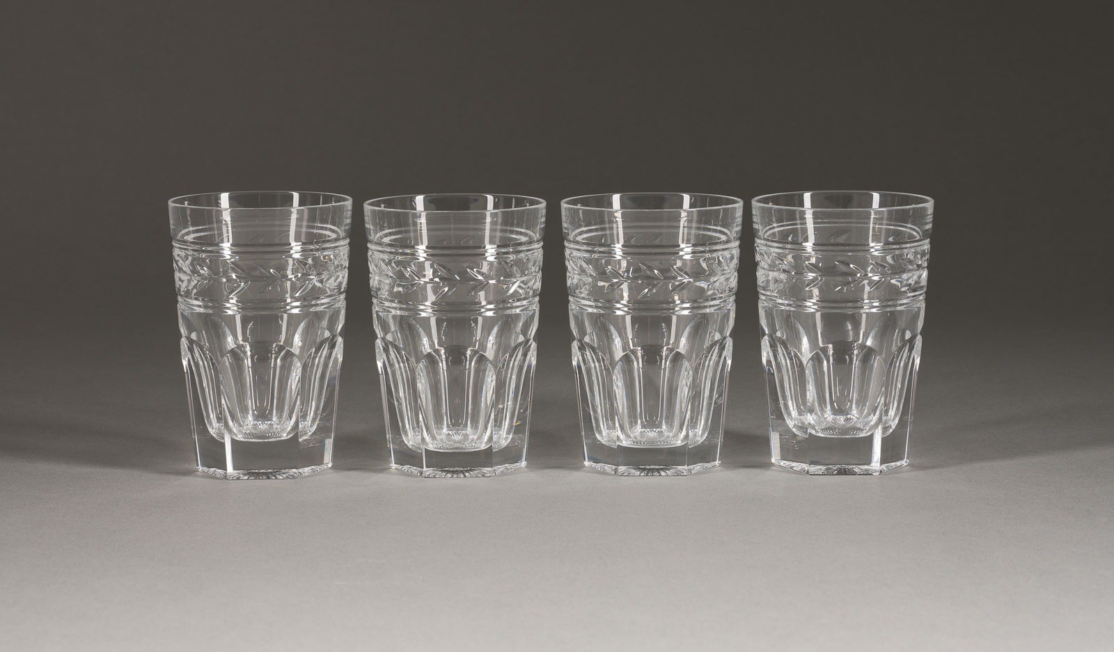 Farbloses Kristallglas, geschliffen. H. 10,5 cm. Jeweils mit Ätzstempel im Boden.