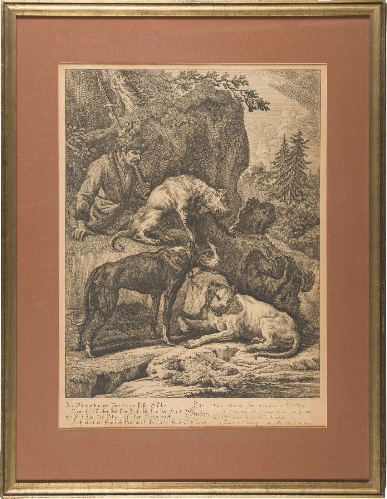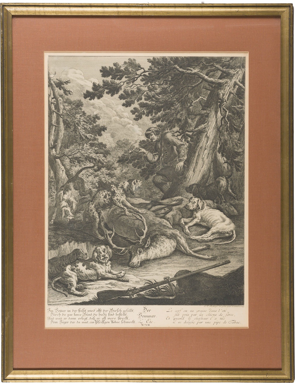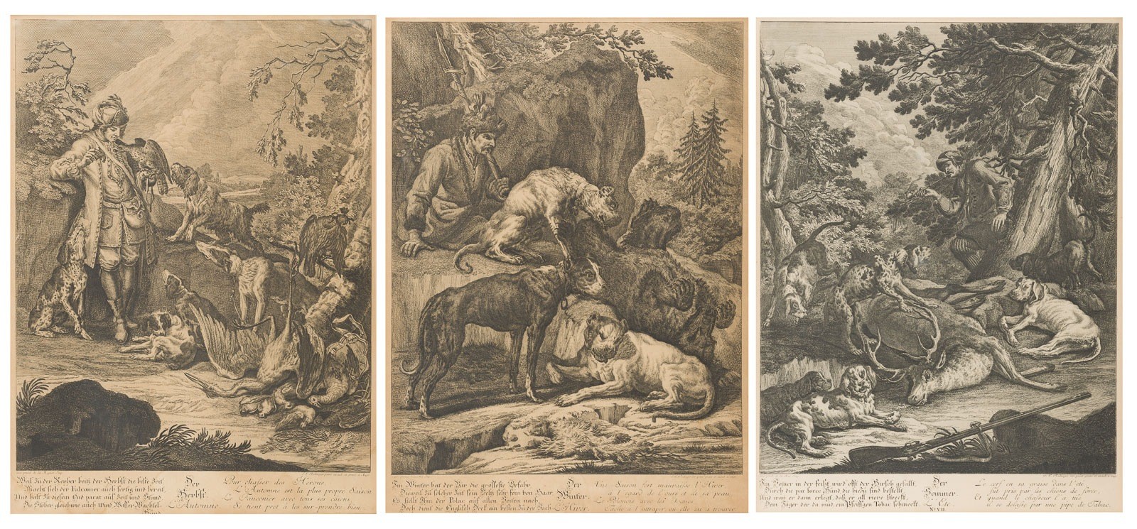 JOHANN ELIAS RIDINGER 1698 Ulm - 1767 Augsburg THREE ENGRAVINGS: 'SUMMER' / 'AUTUMN' / 'WINTER' Copper engraving on paper, later prints. Visible size 46.5 x 34 cm (framed 63 x 49 x 1.5 cm). Titled in German and French at the bottom center; inscribed in the plate at the bottom right: 'J. E. Ridinger inv. peint gravé et excud. a Augs.'. Browned, foxed. Each mounted in a passe-partout and framed behind glass (unopened).