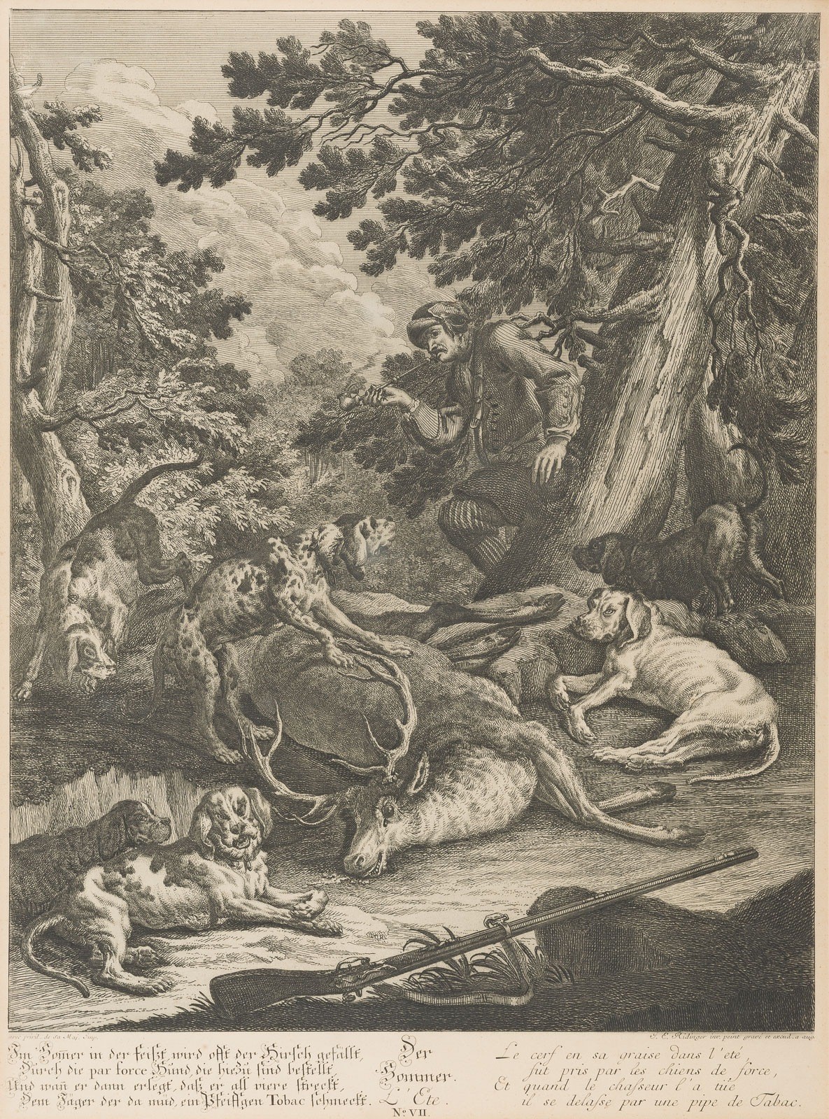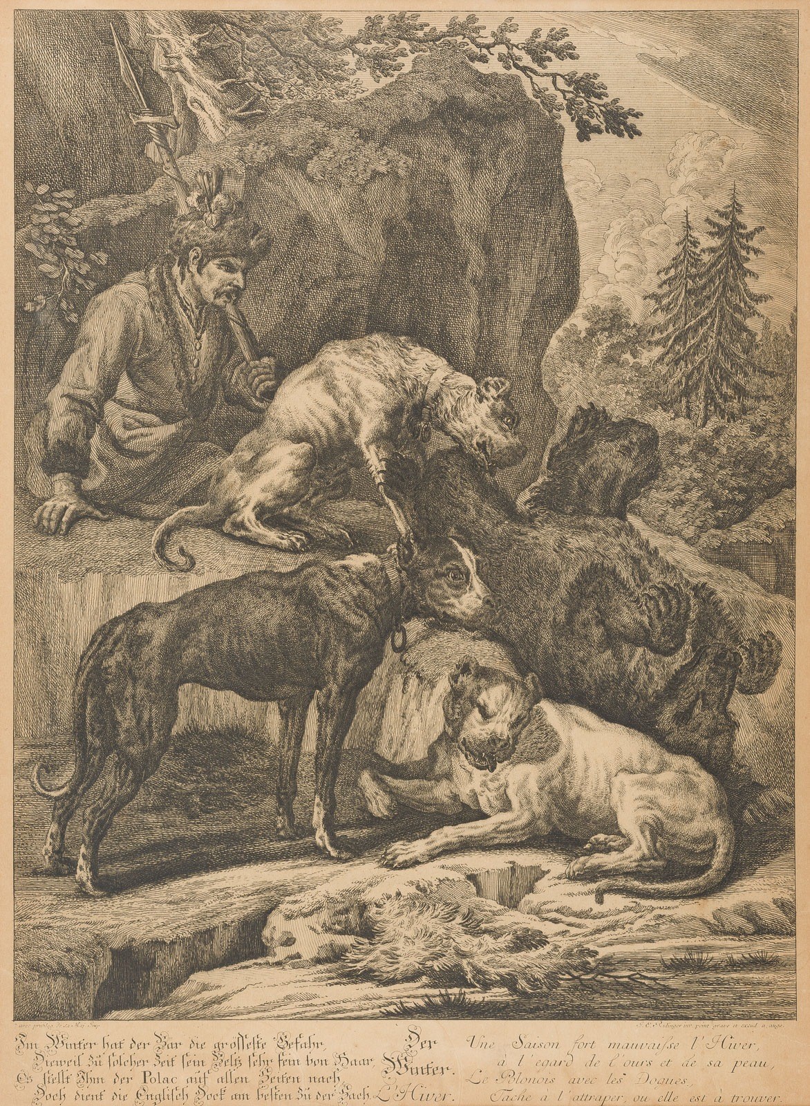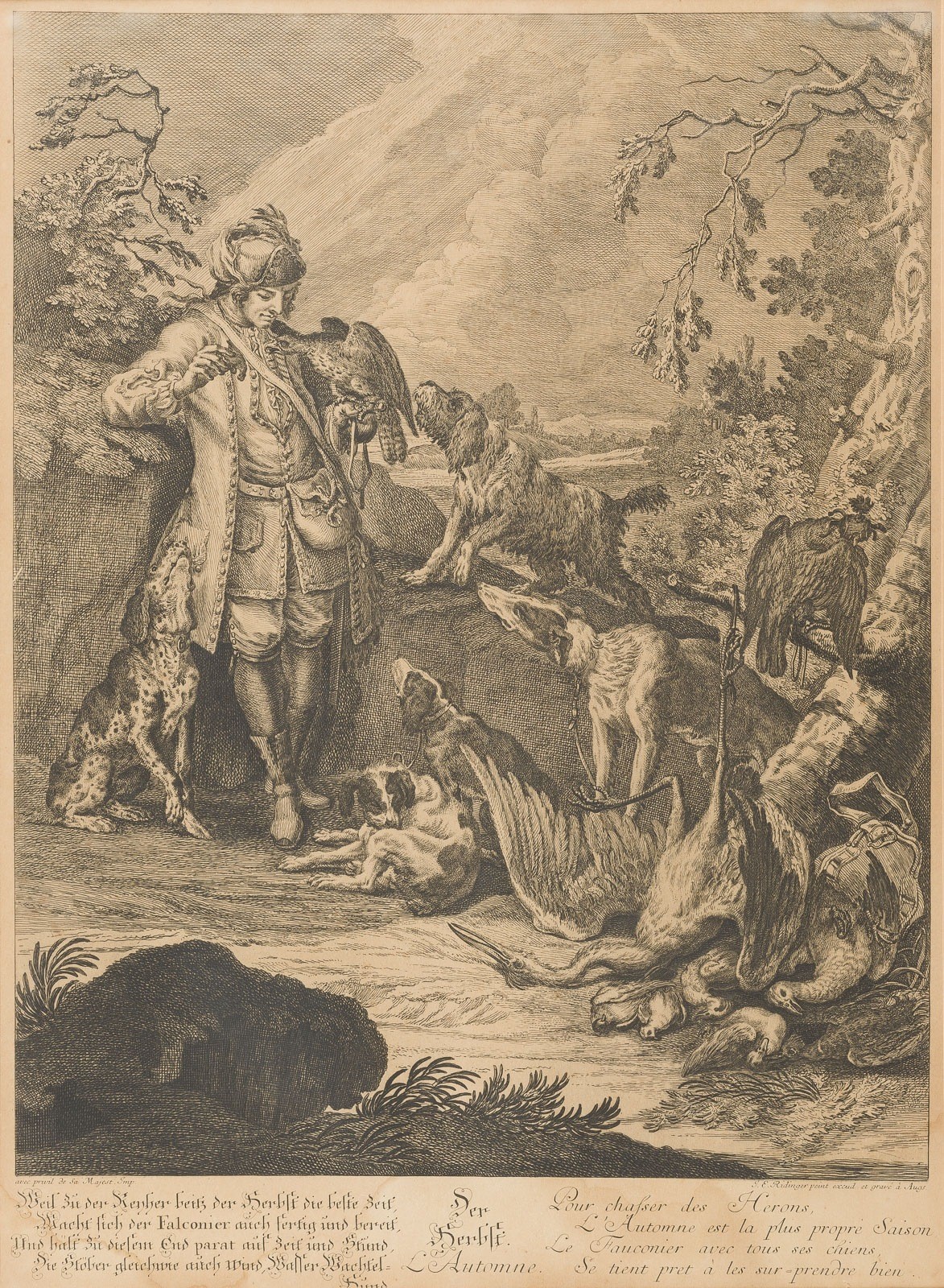 JOHANN ELIAS RIDINGER 1698 Ulm - 1767 Augsburg THREE ENGRAVINGS: 'SUMMER' / 'AUTUMN' / 'WINTER' Copper engraving on paper, later prints. Visible size 46.5 x 34 cm (framed 63 x 49 x 1.5 cm). Titled in German and French at the bottom center; inscribed in the plate at the bottom right: 'J. E. Ridinger inv. peint gravé et excud. a Augs.'. Browned, foxed. Each mounted in a passe-partout and framed behind glass (unopened).
