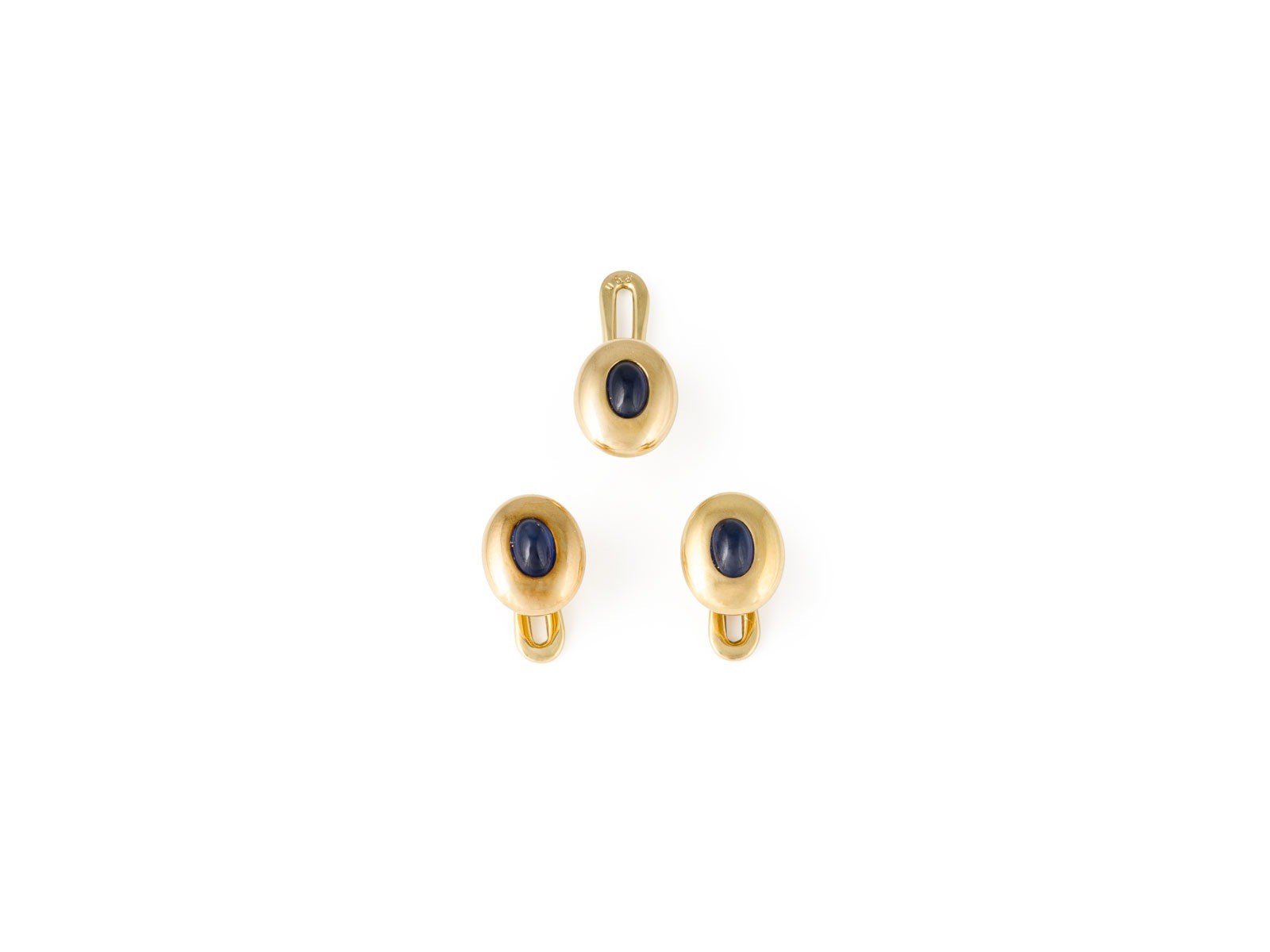 GG 750. Maße: ca. 11,8 mm x 9,7 mm. Ges.-Gew.: ca. 9,6 g. 3 Frackhemdknöpfe, jeweils besetzt mit einem Saphir Cabochon á 0.50 ct.