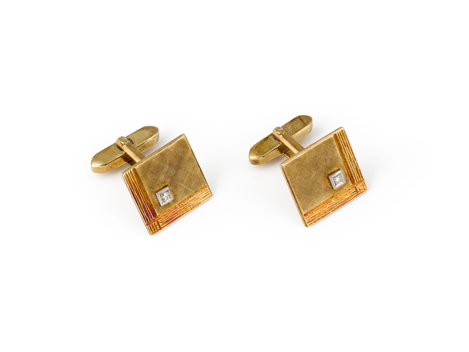 GG 585. Maße: ca. 17,4 mm x 26,3 mm. Ges.-Gew.: ca. 11,9 g. Eckige Manschettenknöpfe, besetzt mit jeweils einem Diamanten im 8/8-Schliff von ca. á