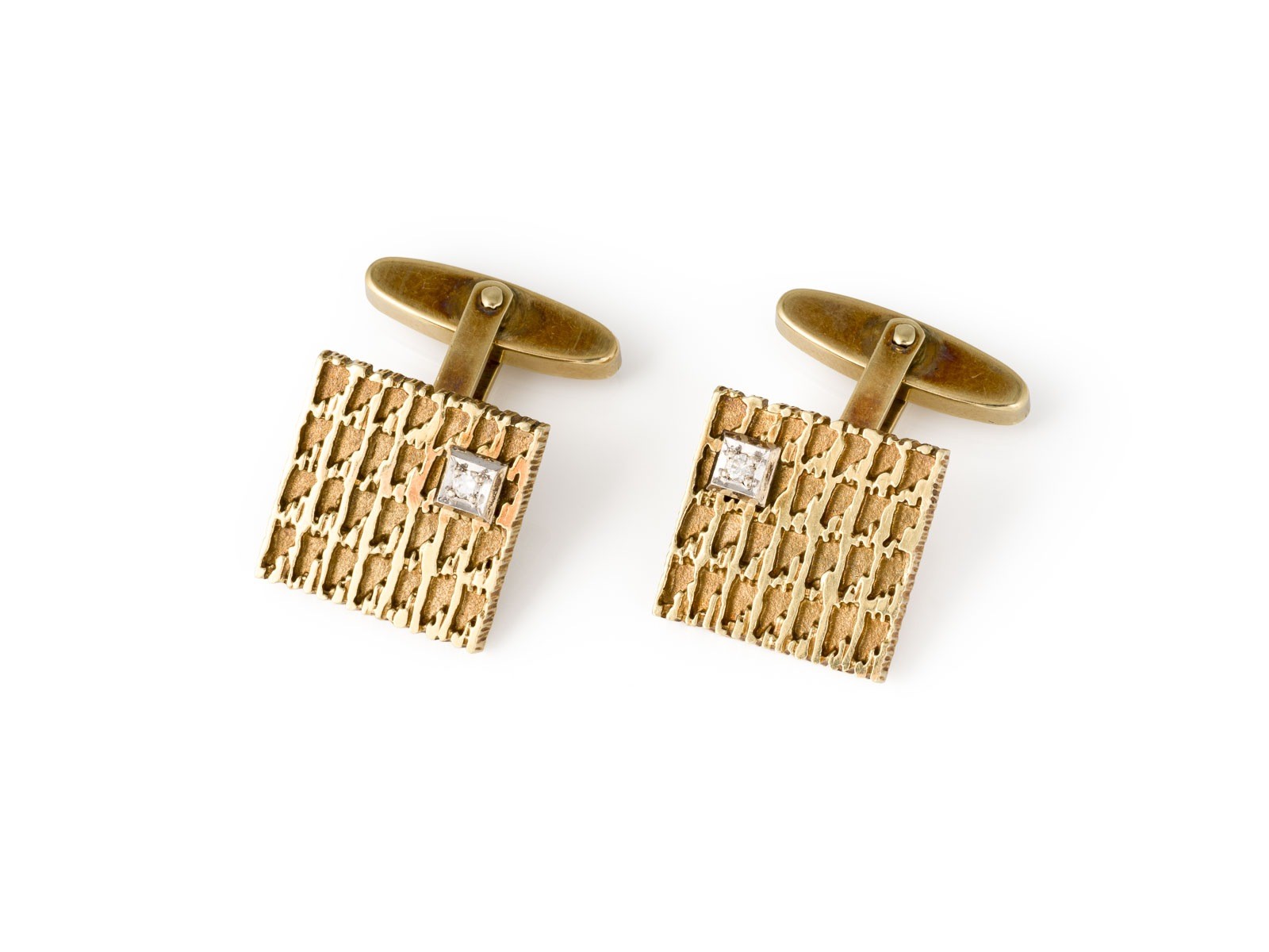 GG 585. Maße: ca. 16,3 x 16,5 mm. Ges.-Gew.: ca. 13,8 g. Quadratische Manschettenknöpfe mit Hahnentritt-Muster und jeweils einem Diamanten, die