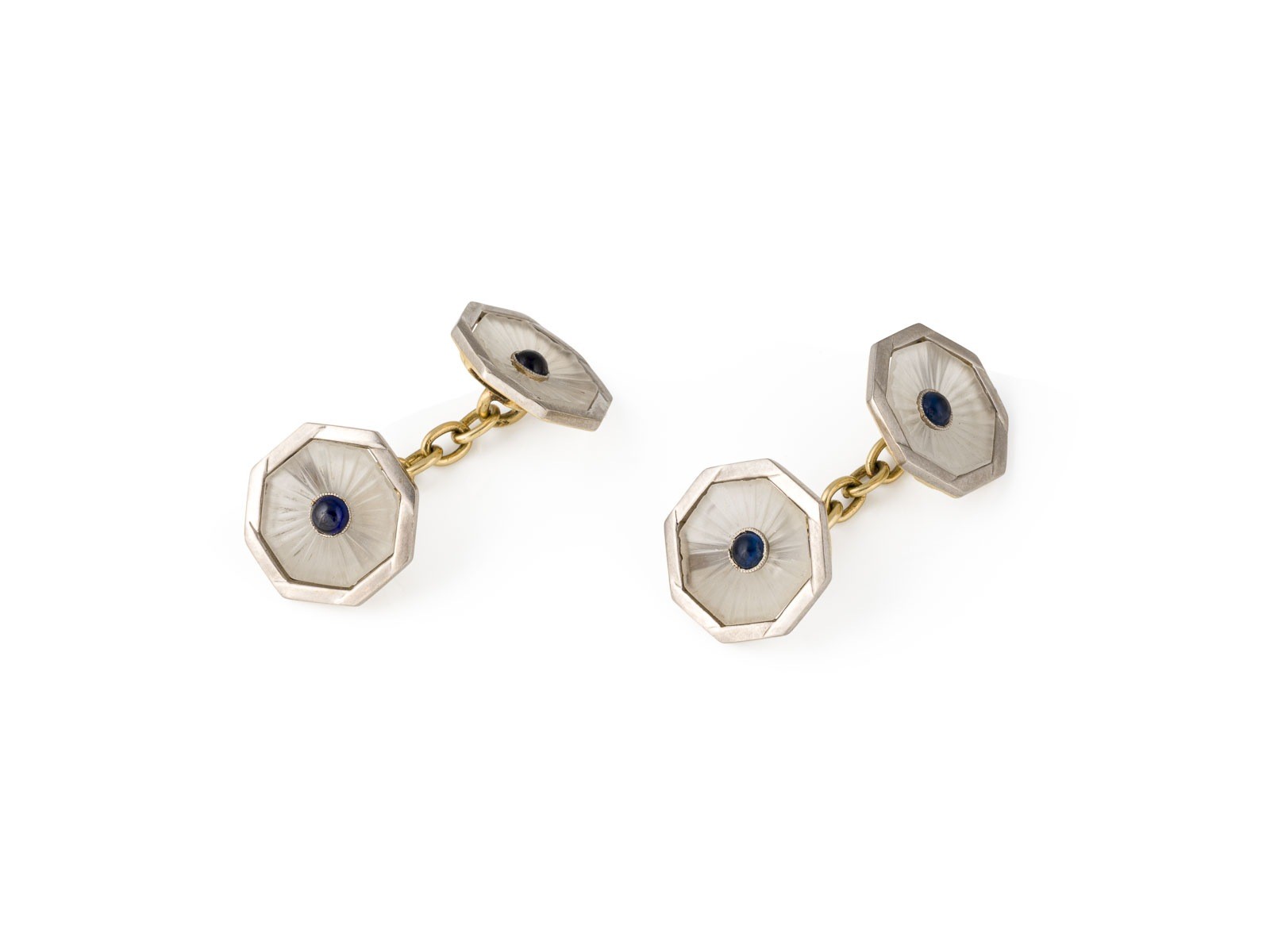PT/GG 585 (getestet). Maße: ca. 13,6 mm x 13,8 mm. Ges.-Gew.: ca. 7,1 g. Manschettenknöpfe in oktagonaler Form, besetzt mit jeweils einem blauen Farbstein