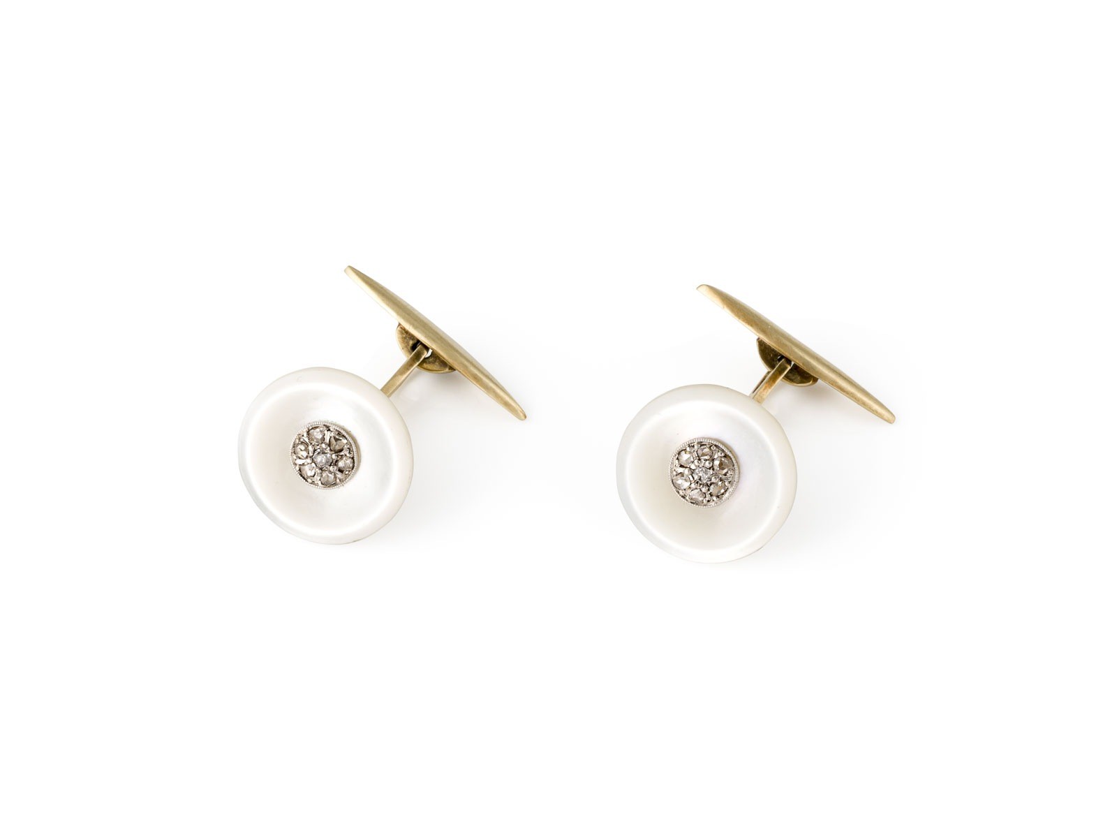 GG 585. Maße: D.: ca. 15,0 mm. Ges.-Gew.: ca. 7,0 g. Runde Perlmutt Manschettenknöpfe, besetzt mit kleinen Rosendiamanten zus. ca. 0.05 ct.