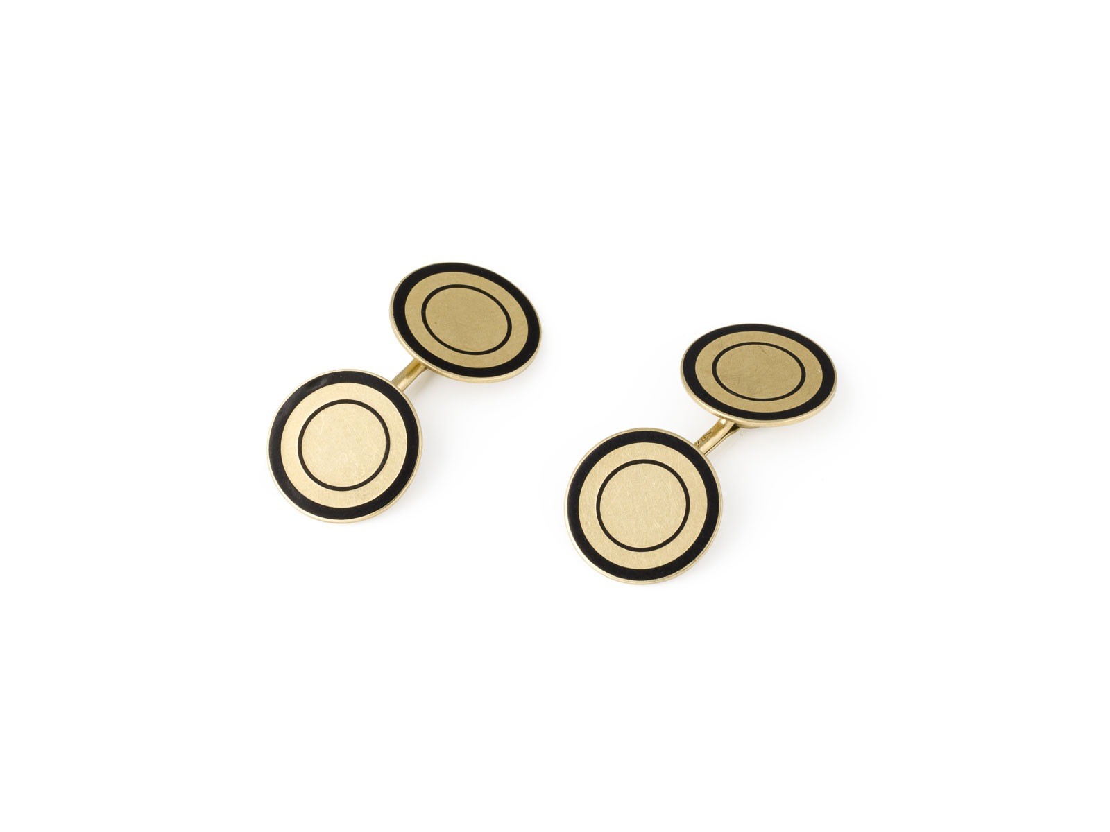 GG 585. Maße: D.: ca. 14,0 mm. Ges.-Gew.: ca. 6,4 g. Runde Manschettenknöpfe mit schwarzer, kreisförmiger Emaille.