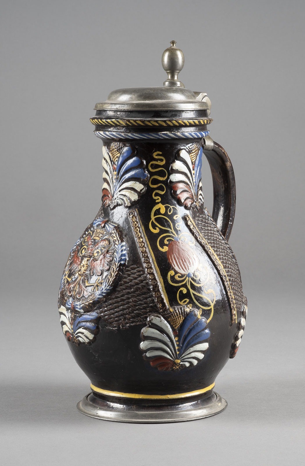Keramik, rötlicher Scherben, braun glasiert, polychrom bemalt, gold staffiert, Zinnmontierung. 26,5x16x14 cm (mit Daumenrast gemessen). Birnförmiger Krug mit Zinndeckel und -fußrand. Seitlicher Henkel. Wandung durch