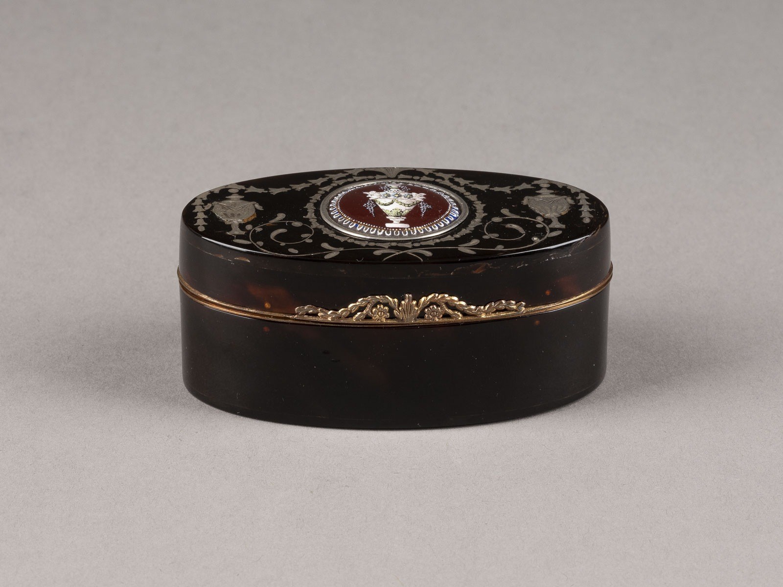 FINE TOBACCO BOX WITH VASE MOTIF * France, circa 1780 Tortoiseshell, silver inlays, enamel, gilt metal mount. Length 7.8 cm. Please note that due to current CITES regulations, unrestricted trade is only permitted within the European Union. Export to third countries is not possible.